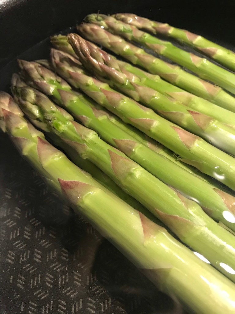 Voeg de asperges toe in de pan en kook ze voor ongeveer 5 minuten.