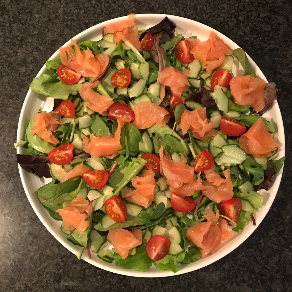 Beleg dan met de tomaatjes , komkommer en ( toefjes) zalm.