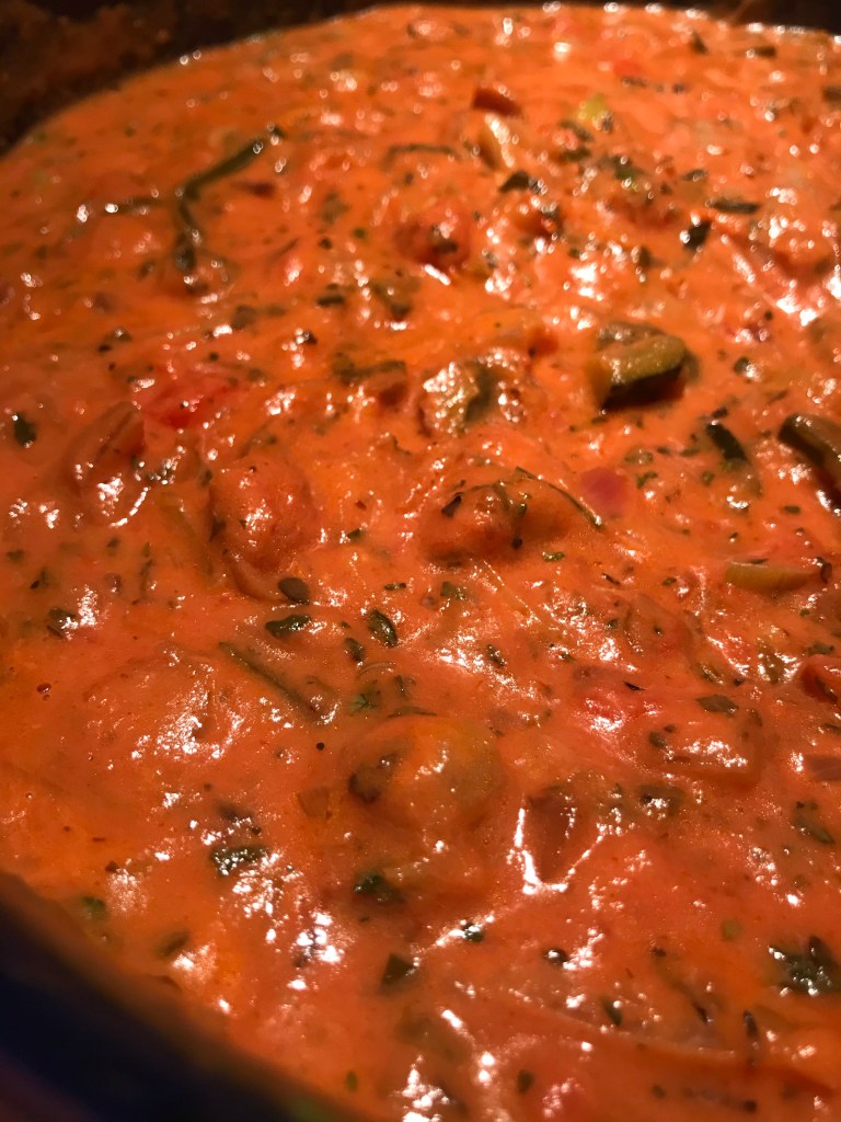 Tomatenblokjes en passata en kookroom toevoegen.