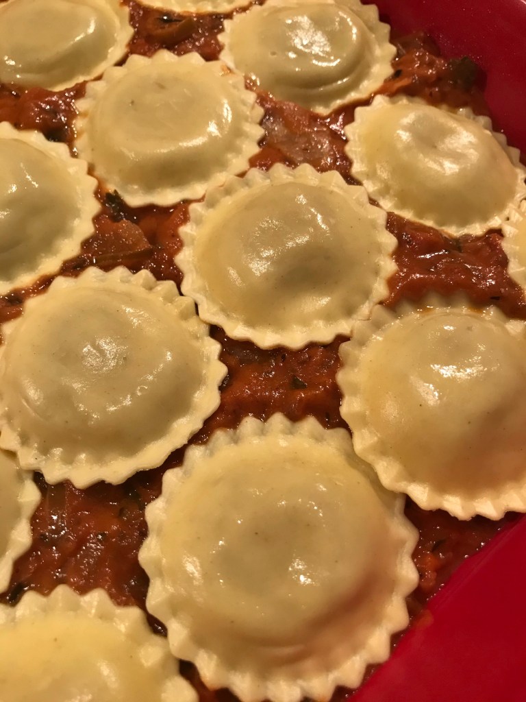 Verdeel de helft van de ravioli erover.