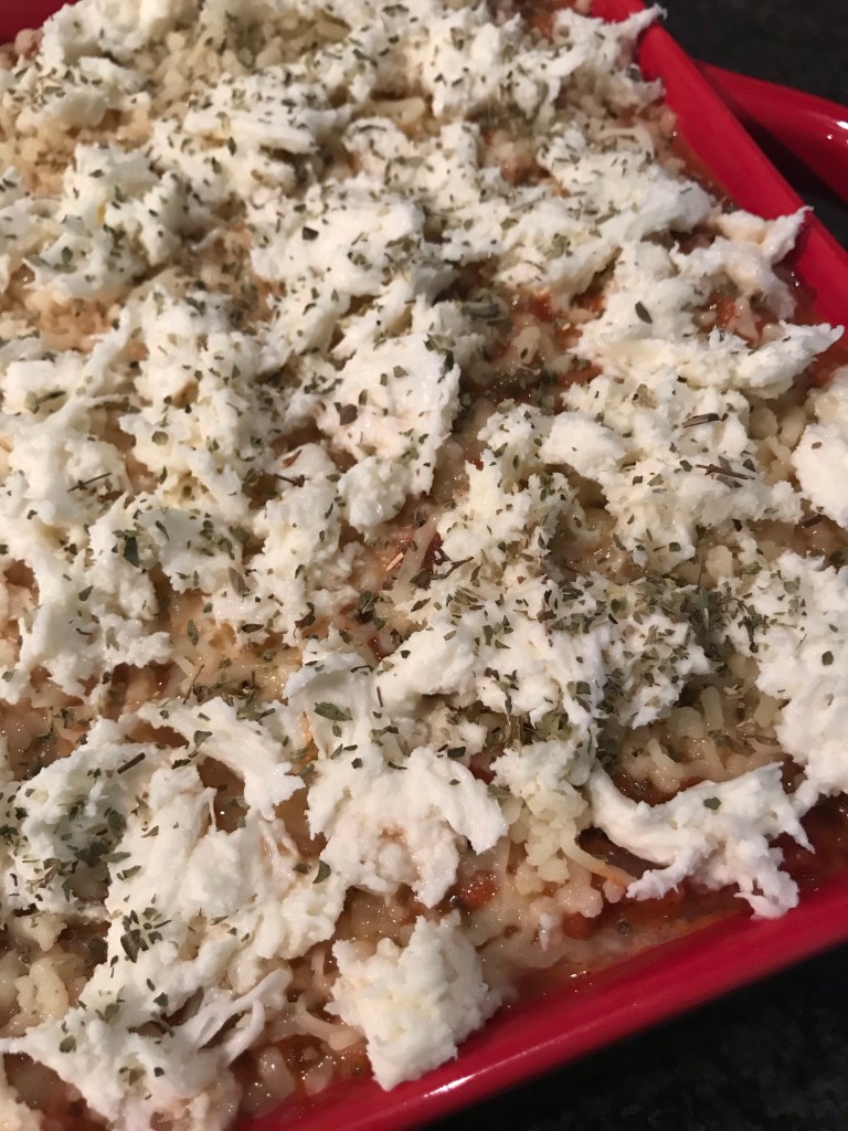 Scheur de mozzarella in stukjes en verdeel de helft daarvan over de laag tomatensaus.