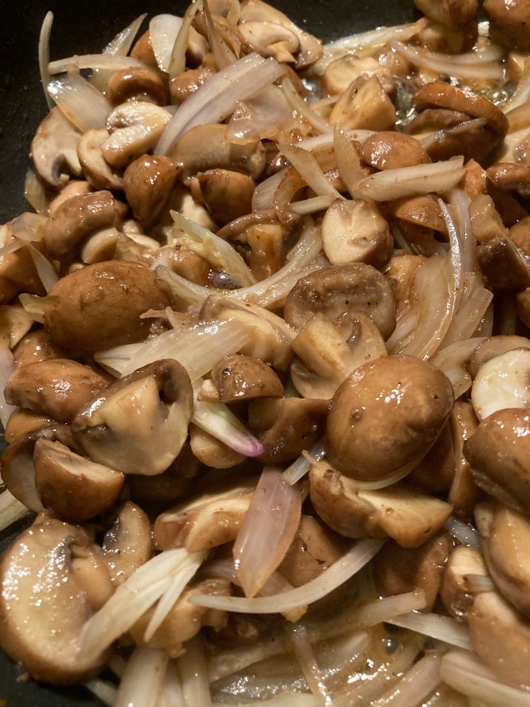 Verwarm in een koekenpan de olijfolie en bak hierin de kastanjechampignons , voeg als ze beginnen te verkleuren