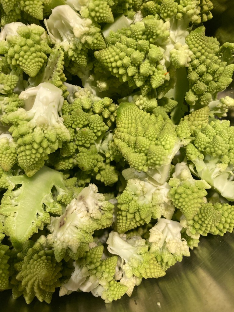 Snijd de romanesco in kleine roosjes, was deze en kook ze in gezouten water, ca. 6 min.