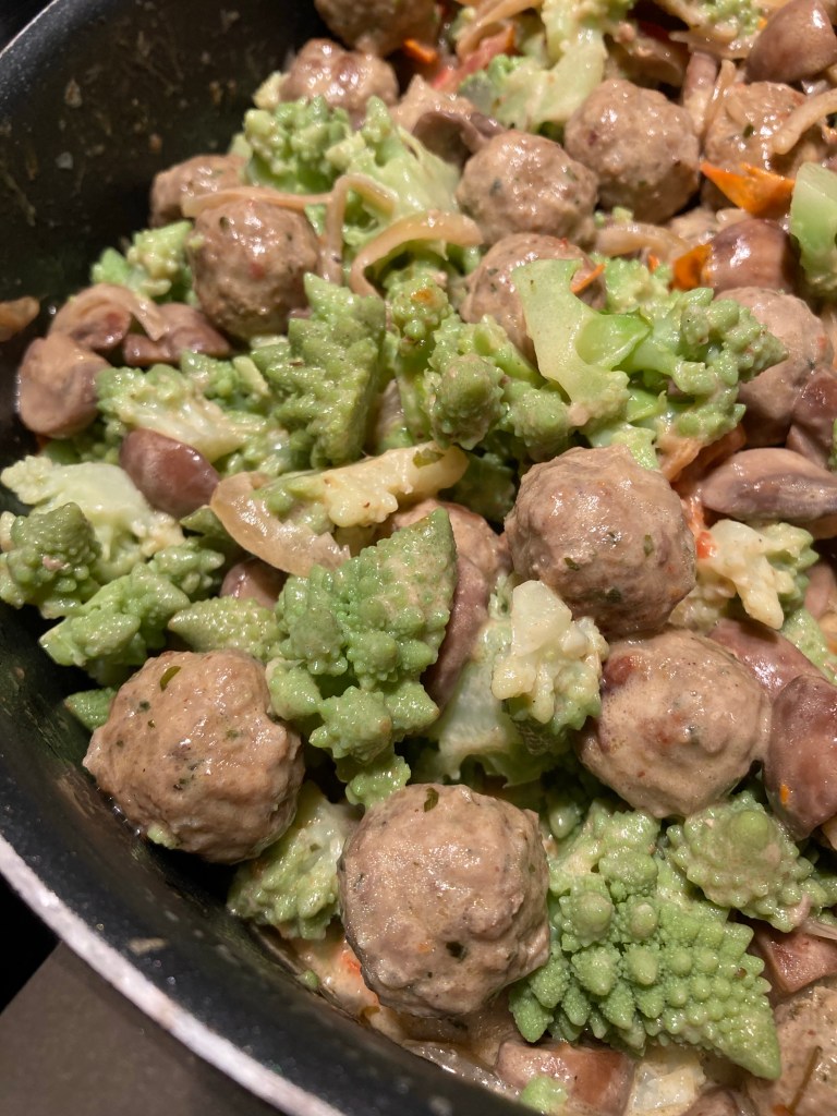 Pasta met Romanesco , Kastanjechampignons en Pesto Gehaktballetjes