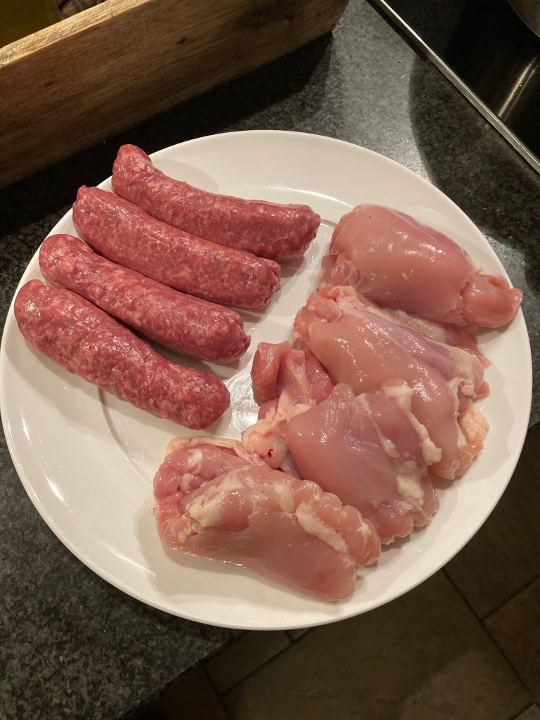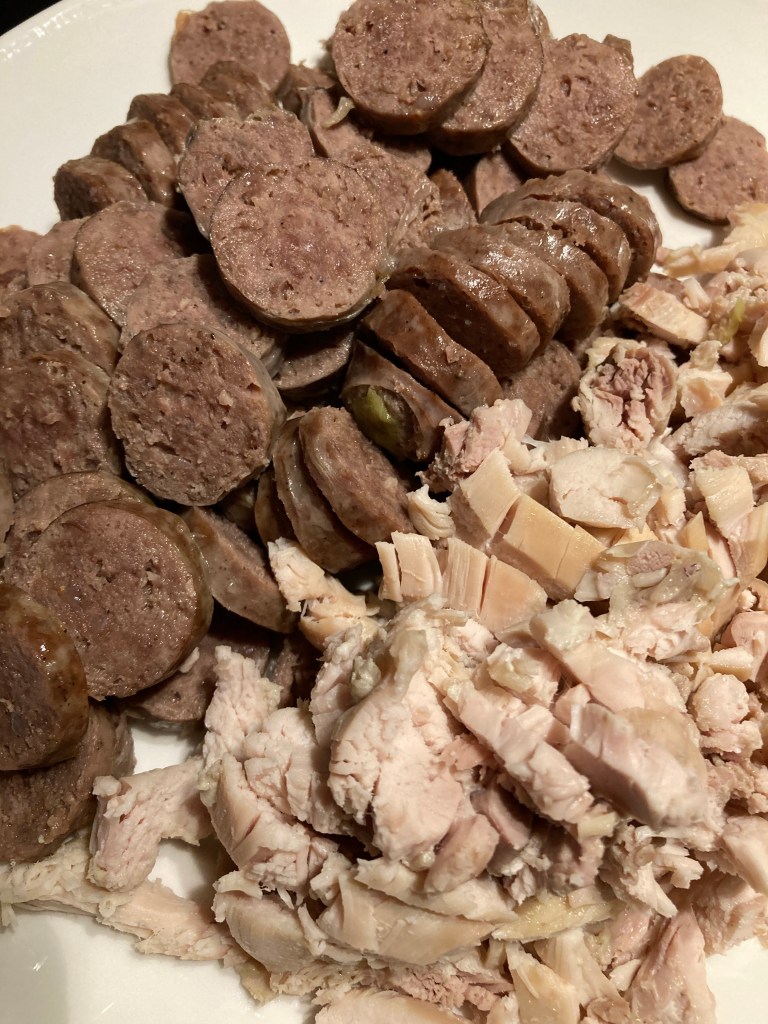 Snijd ondertussen de kip in stukjes en de rundersaucijs in plakjes , evt ontdoen van zijn velletje.