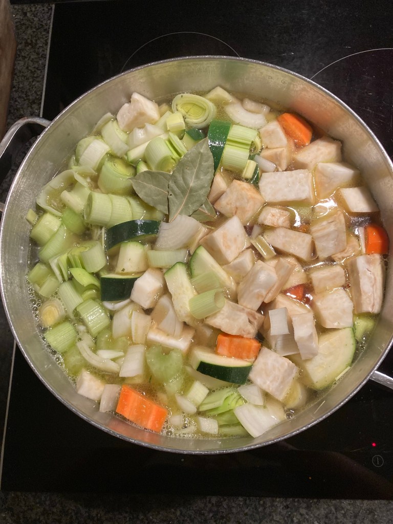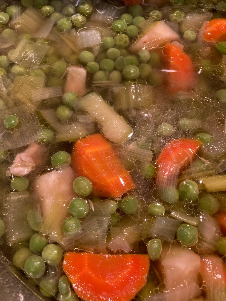 Voeg alle groenten en laurier , behalve de jonge velderwtjes toe aan de bouillon en laat de soep 25 min. zachtjes doorkoken.