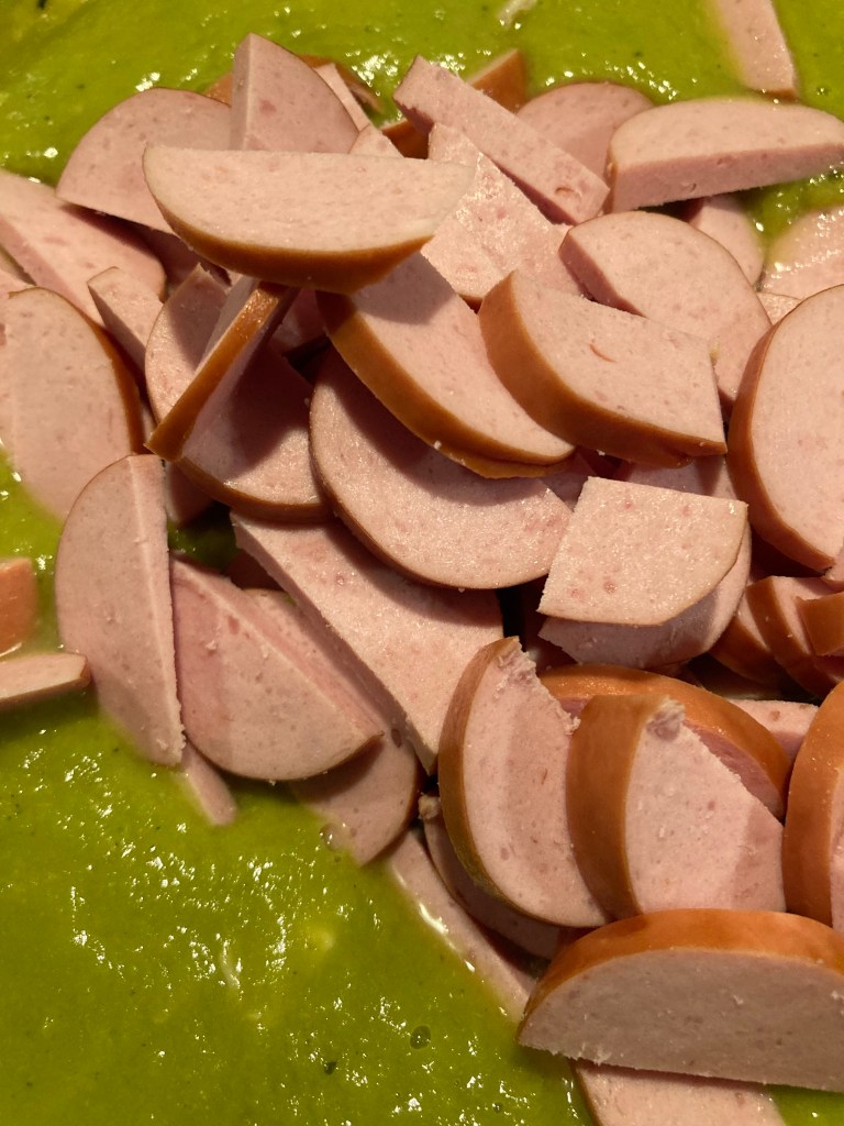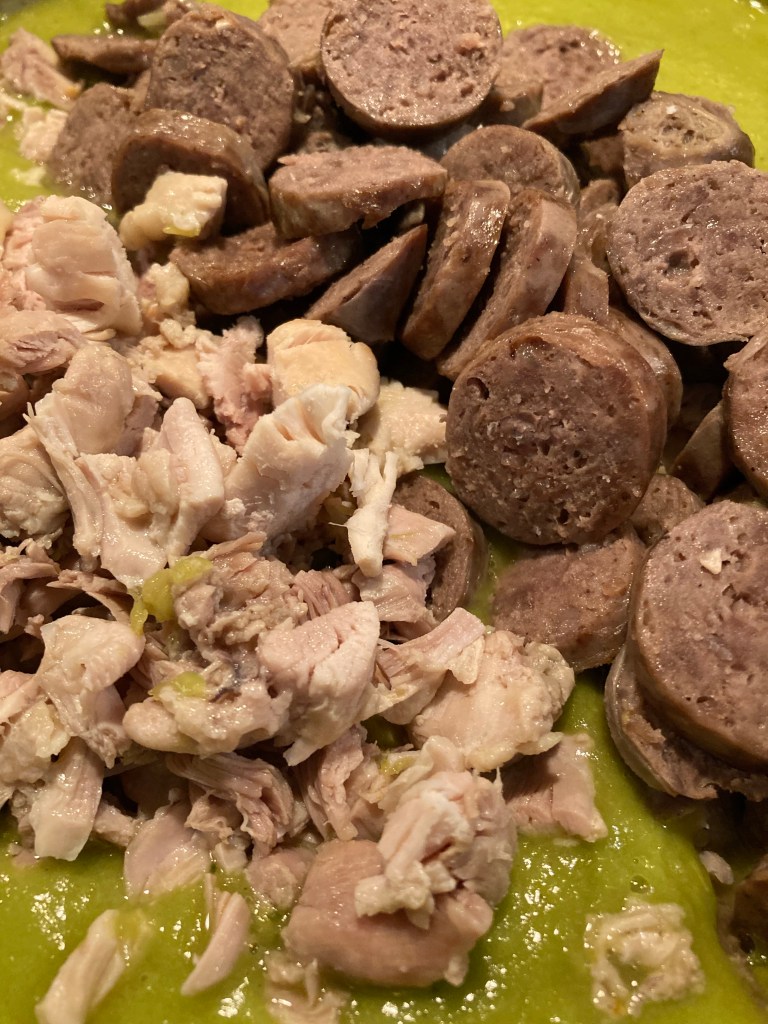 Pureer de soep tot een glad geheel en voeg de kip en saucijs stukjes toe. ( en de rookworst als je die toevoegt)