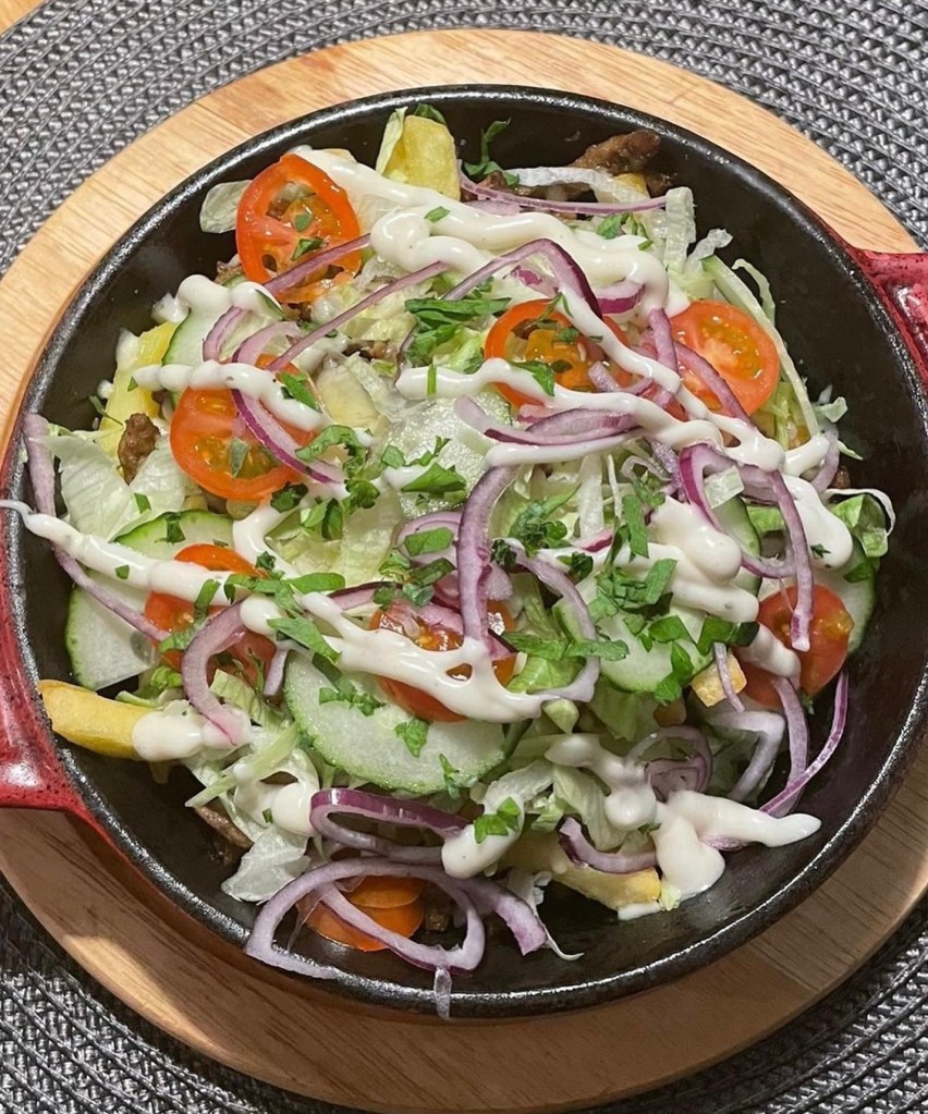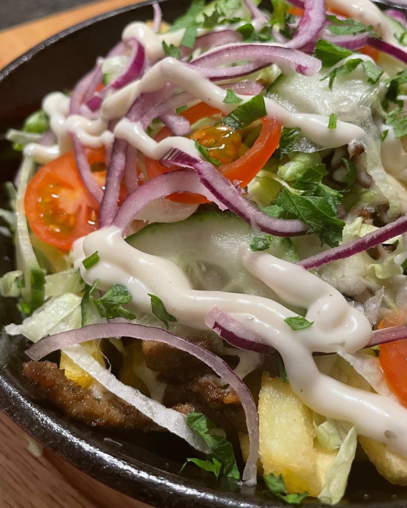Verdeel er de sla , komkommer , tomaat en rode ui over en serveer de kapsalon met knoflooksaus.