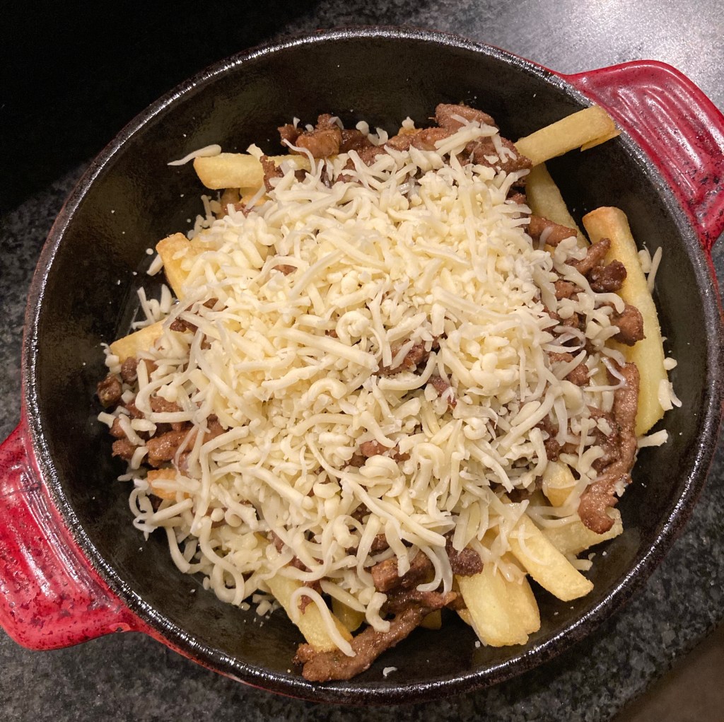 Verdeel de friet over 1 of meerdere ovenvaste schaaltjes en verdeel hier de shoarma over.