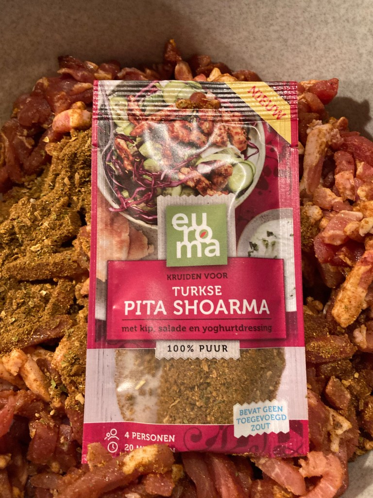 Snijd het vlees in dunne reepjes en meng dit met de shoarmakruiden en 3 lepels zonnebloemolie.
