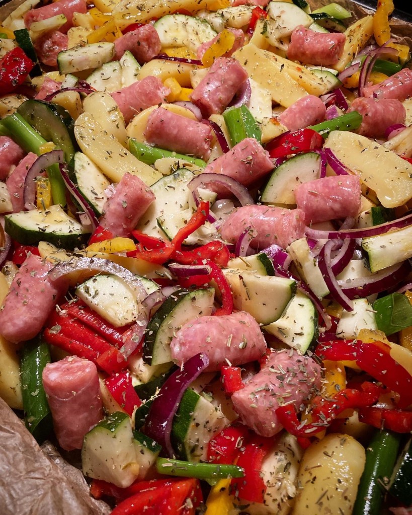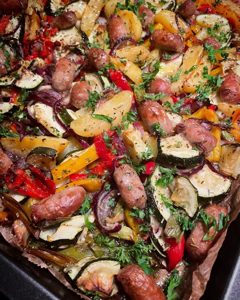 Traybake met aardappelwedges ,courgette ,paprika en chipolataworstjes