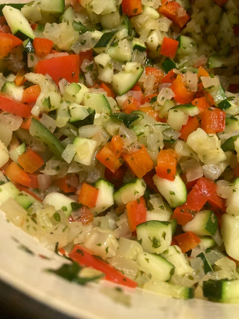 Verhit in een koekenpan , 2 el zonnebloemolie en bak hierin de groenteblokjes met knoflook gaar , voeg als laatste de lente-ui toe.