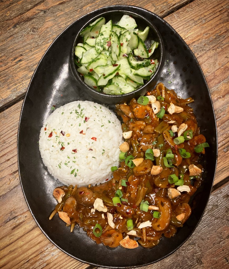 Serveer met Pandanrijst en garneer met cashewnootjes , bosui en evt. chilivlokken.