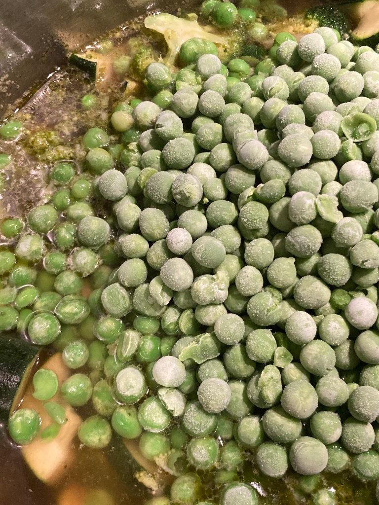 Voeg de broccoliroosjes, courgette en erwten toe en kook ze 5 minuten mee.