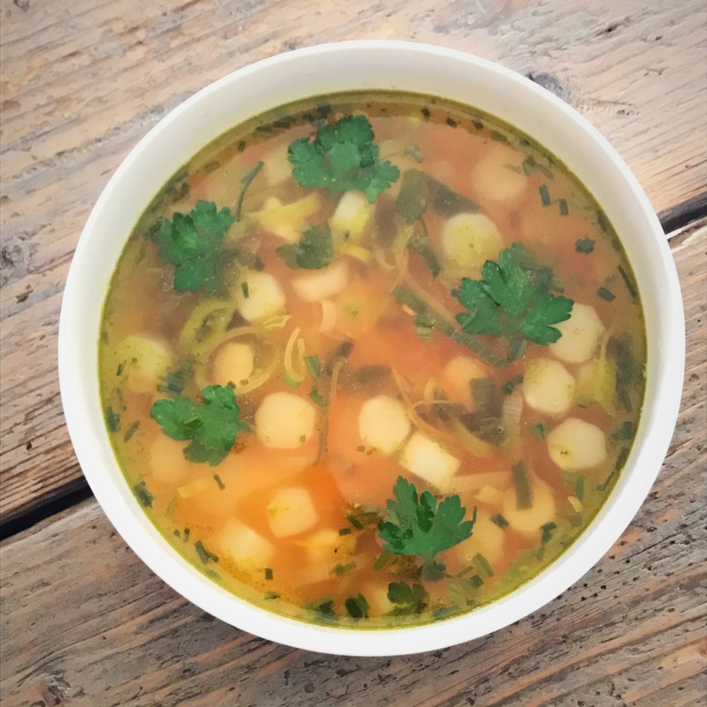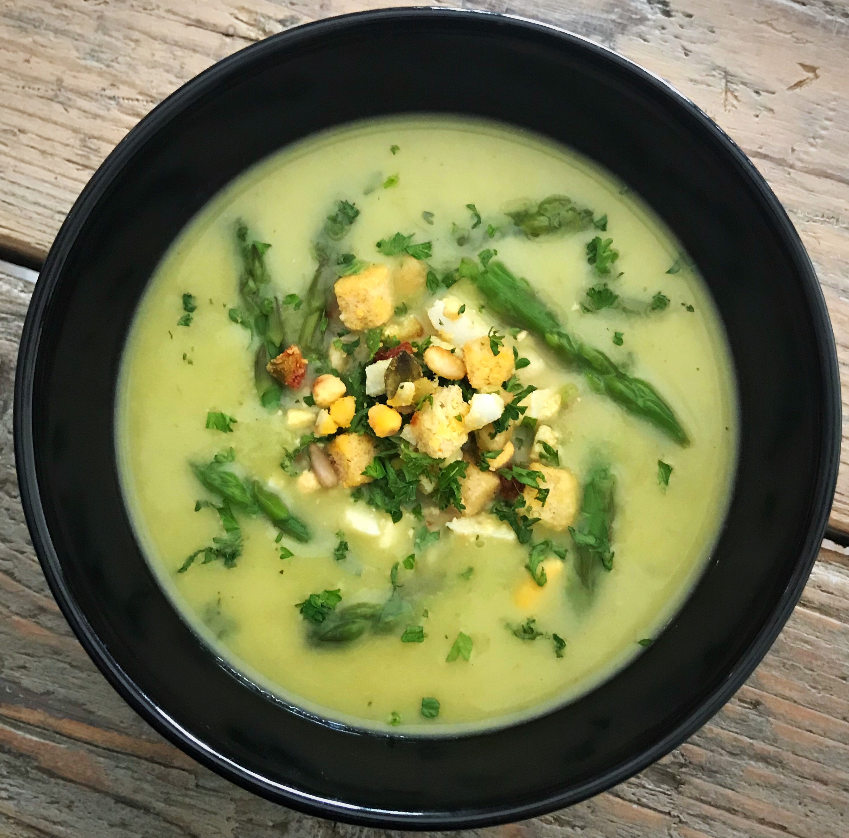 Deze heldere aspergesoep bevat natuurlijk asperges, maar daarnaast ook nog prei en wortel en de kruiden bieslook en platte peterselie.