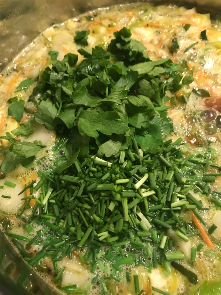 De koppen voeg je na 10 minuten toe, deze hebben namelijk minder garingstijd nodig. Wanneer je de stukjes asperges hebt toegevoegd snijd je intussen de kruiden fijn en doe je deze ook in de soep.