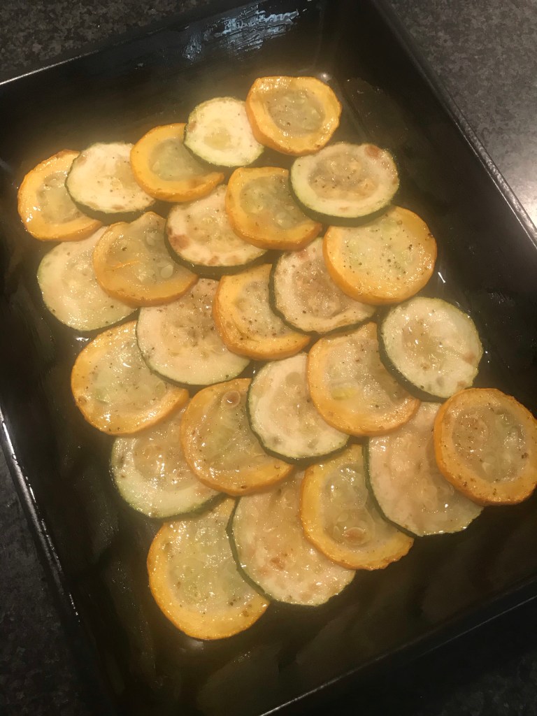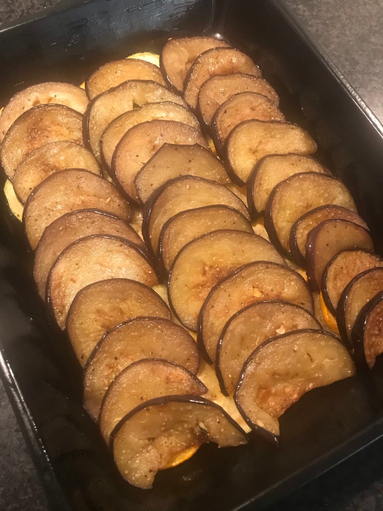 Leg de plakjes aubergine en courgette in een ingevette ovenschaal.