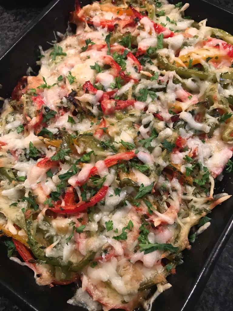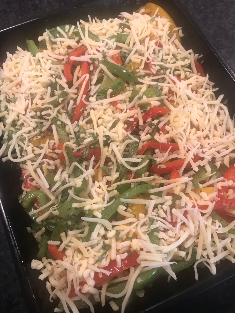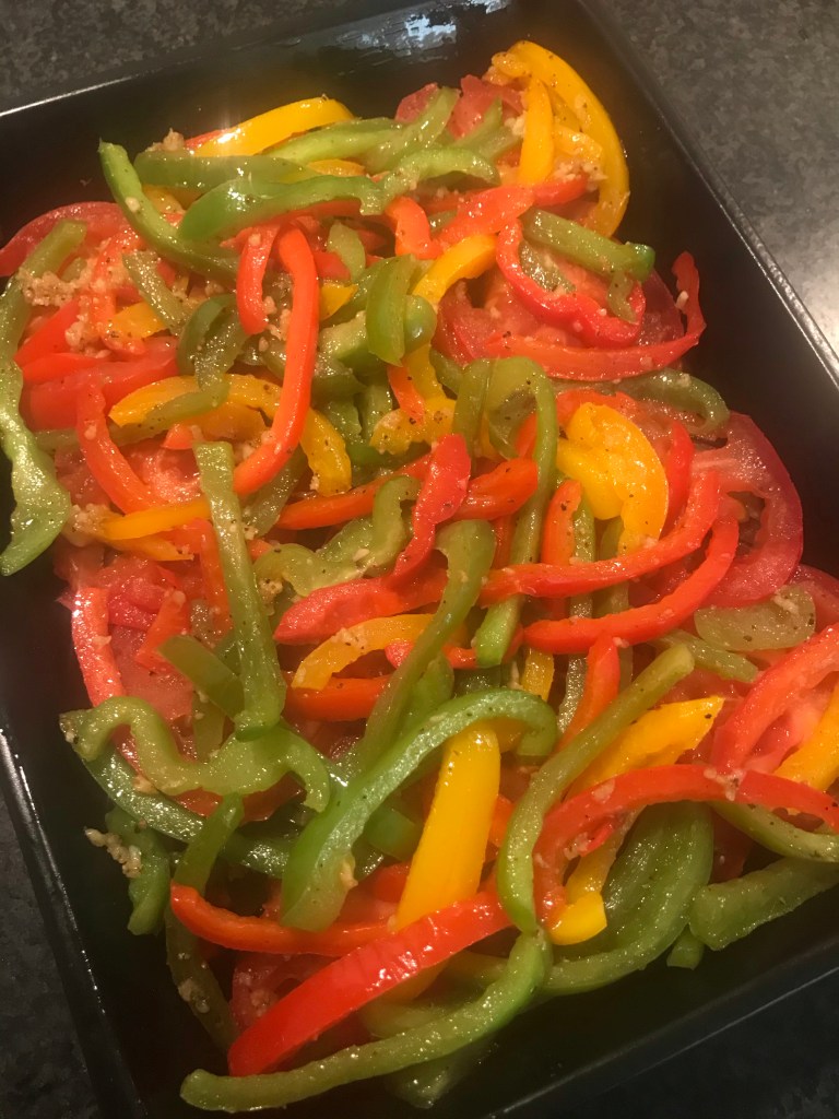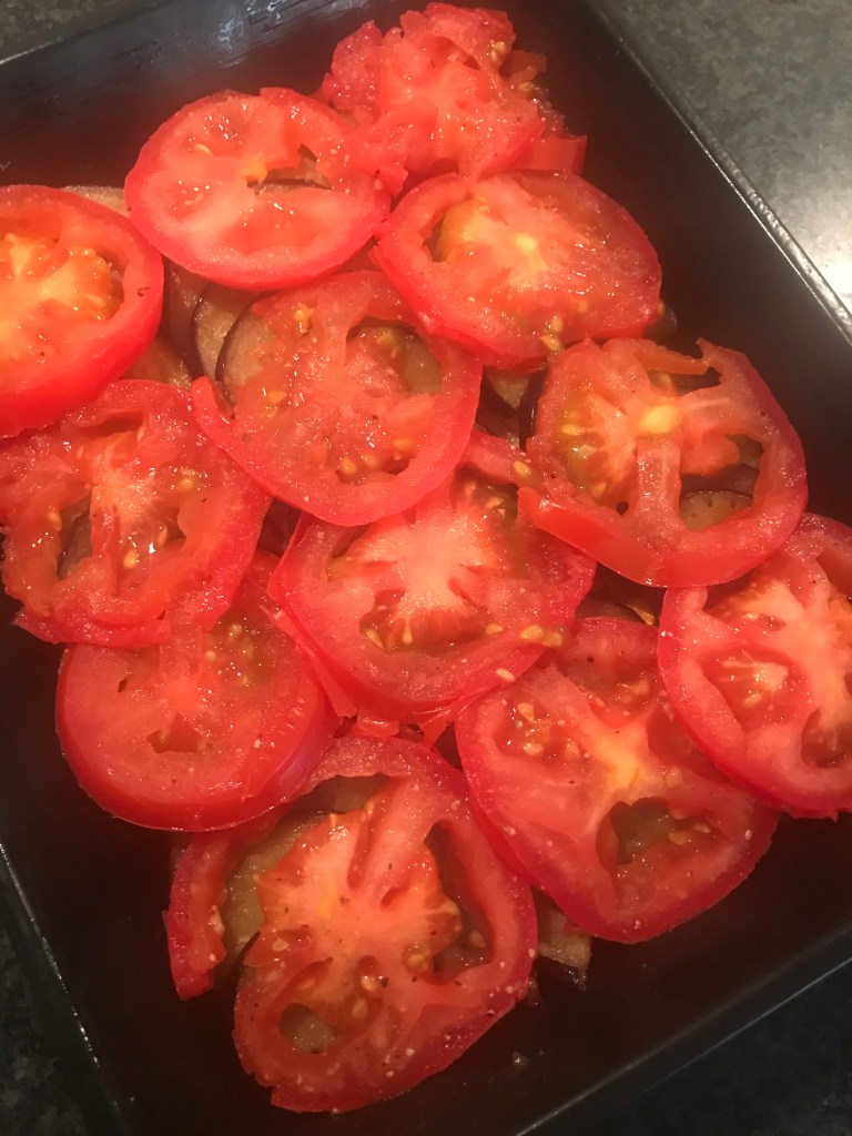 Verdeel daarna de paprikareepjes en de schijven tomaat over de aubergine en courgette.