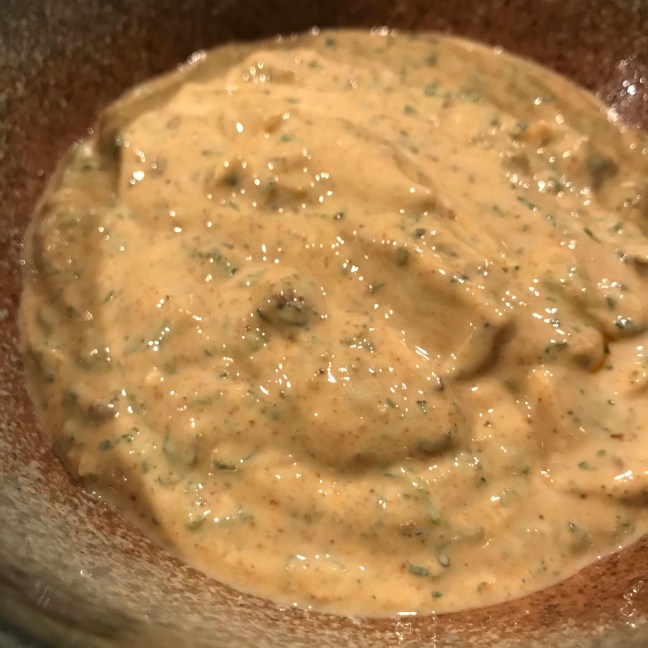 Meng 200 gram van de yoghurt met de citroenrasp en het -sap. Voeg het komijnzaad samen met de knoflook, kerrie, chilipoeder en chili flakes toe aan het yoghurtmengsel.