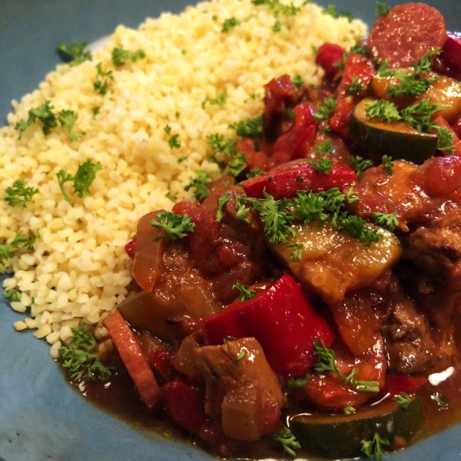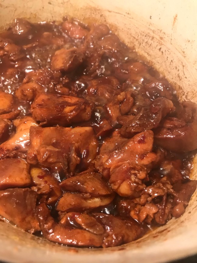 Verwarm de olijfolie in een braadpan en bak de stukken kip in 4-5 minuten rondom bruin. ( Optie: ik had de kip gemarineerd en een nacht in de koelkast laten staan)