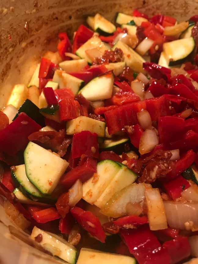 Schep de ui, knoflook, rode peper , courgette en paprika’s door het bakvet en roerbak 2-3 minuten tot de groenten wat zachter worden.