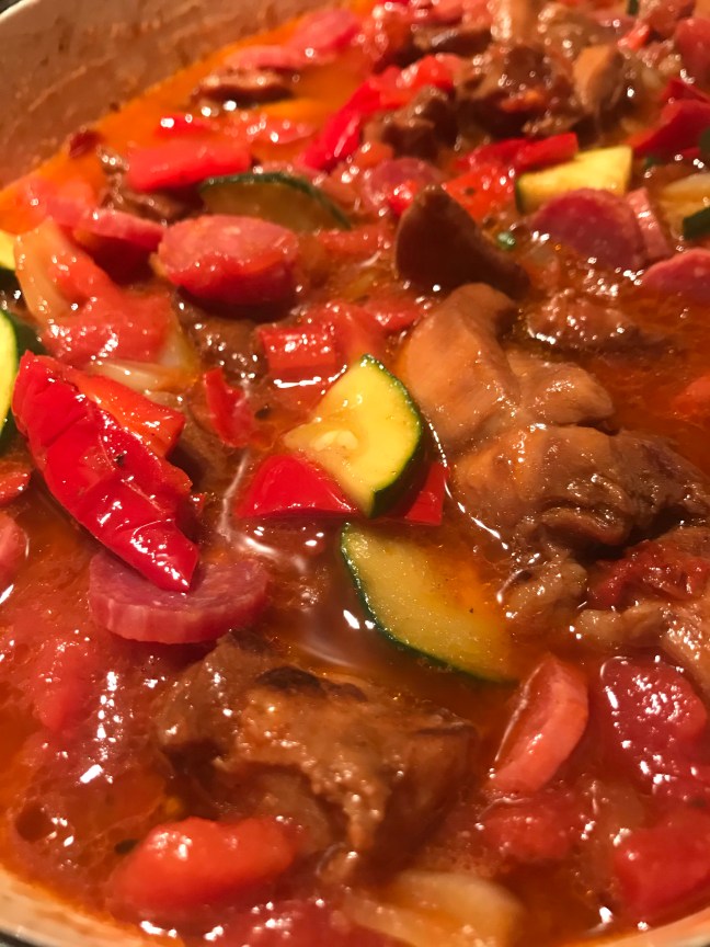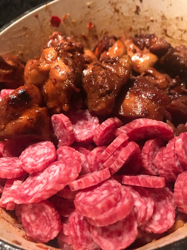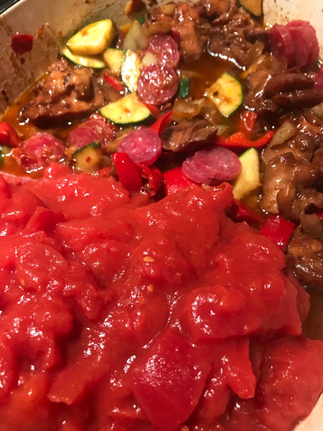 Leg de stukken kip en de plakjes worst in de pan en schenk de bouillon en de tomatenblokjes erbij.