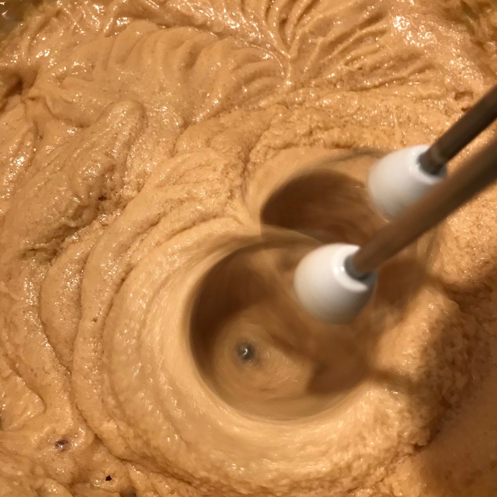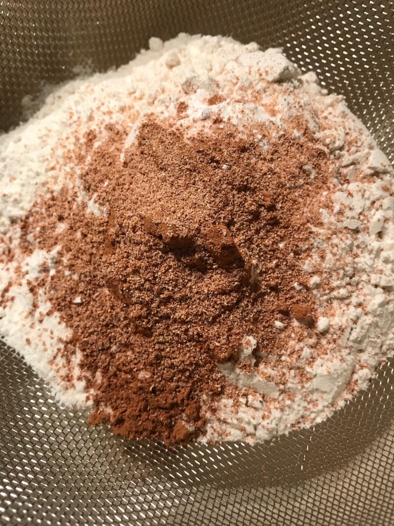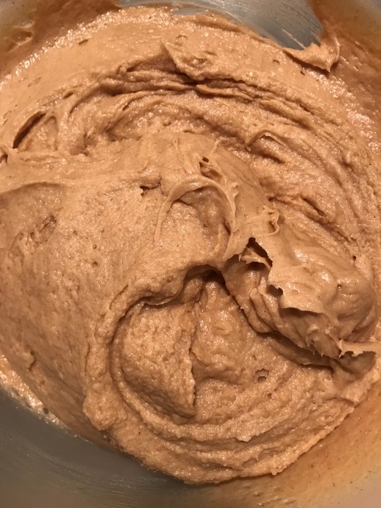 Zeef de bloem, het bakpoeder, het zout, de kaneel en de nootmuskaat boven de kom en spatel dit door het botermengsel tot het mooi is opgenomen (niet meer knoppen met de machine).