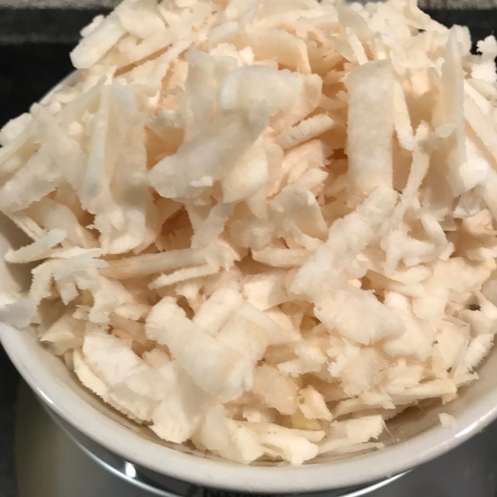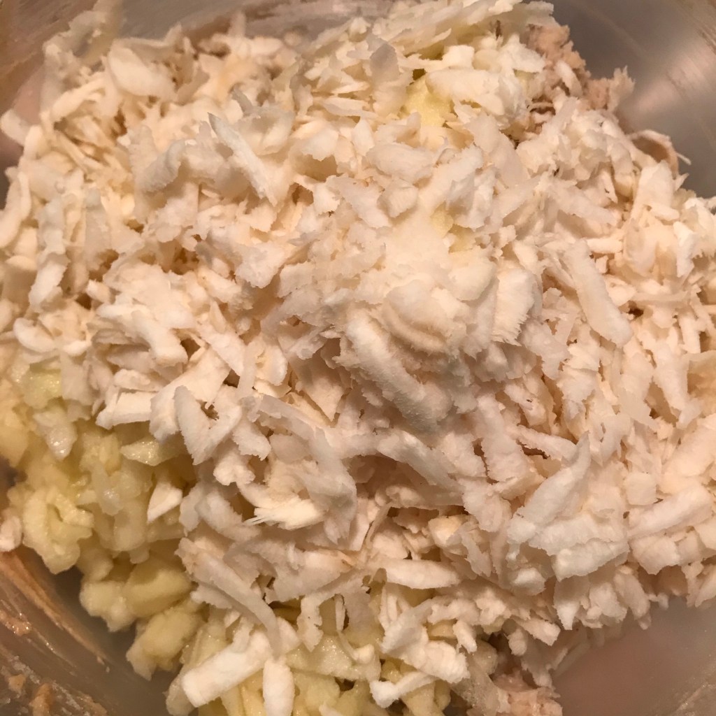Schil de pastinaken en rasp ze grof met een blokrasp.