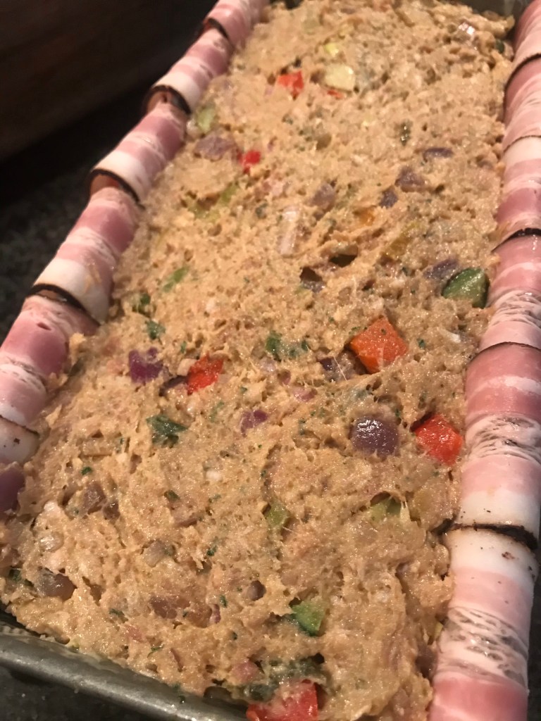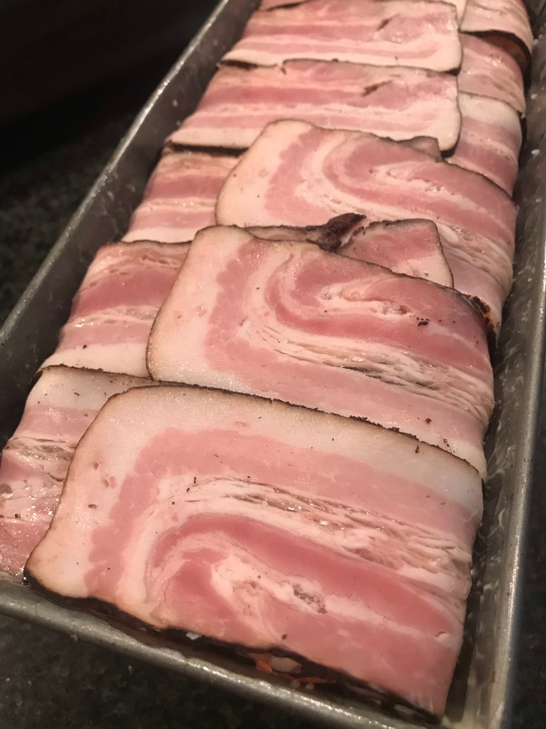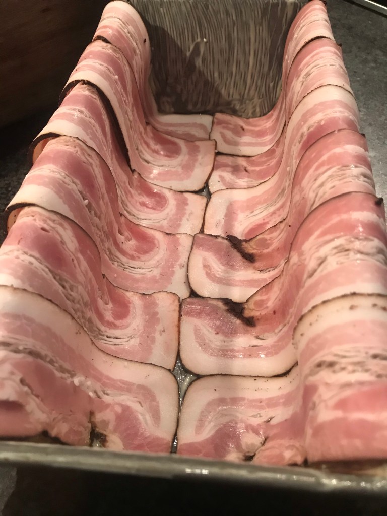 Bekleed de cakevorm met ontbijtspek, steeds een plakje aan weerzijde dat deels de bodem bedekt.