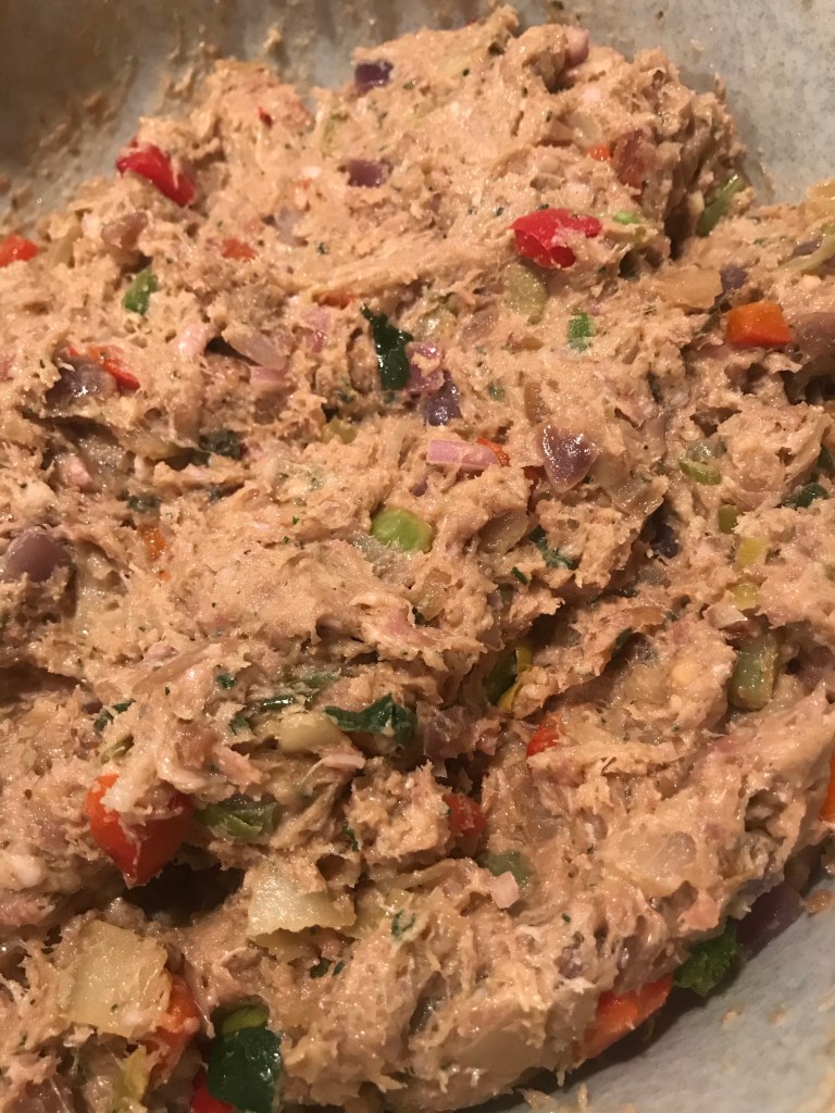 Voeg ook het vierde ei, de paneermeel, de roerbakmix en de pesto toe.