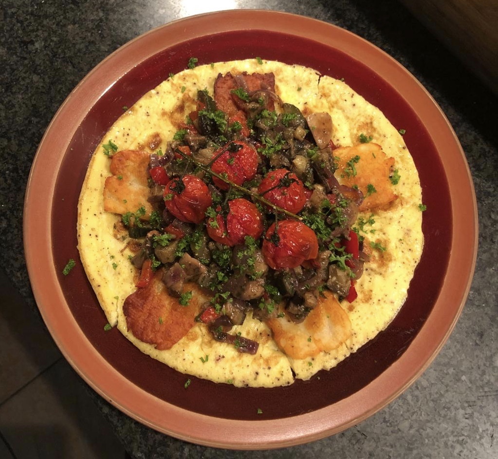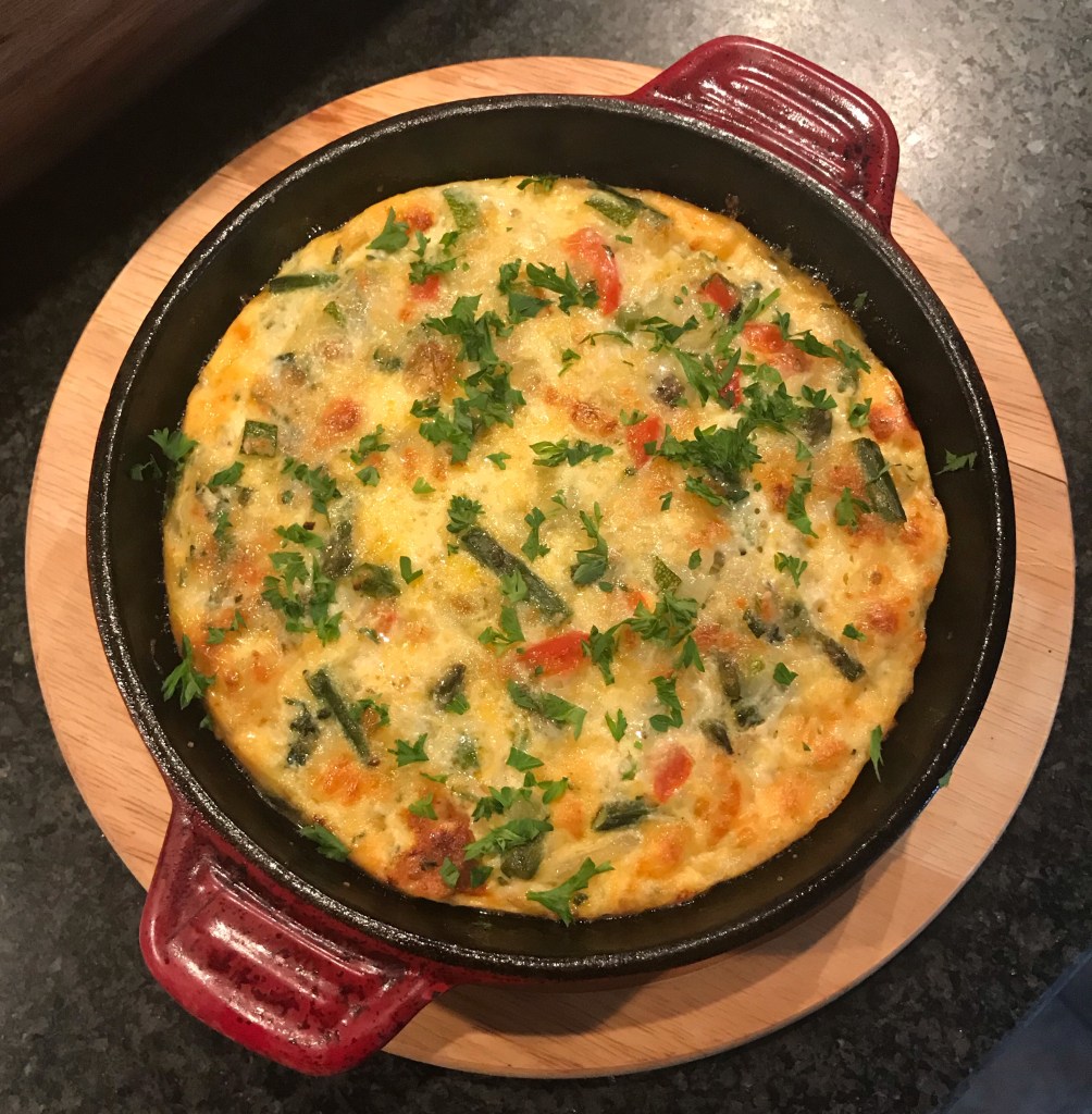 Bak eerst even een paar minuten tot de onderkant van de frittata goed gaar is en zet dan in de oven voor nog eens 10 minuten of tot het ei gaar is en de kaas goudbruin en gesmolten.