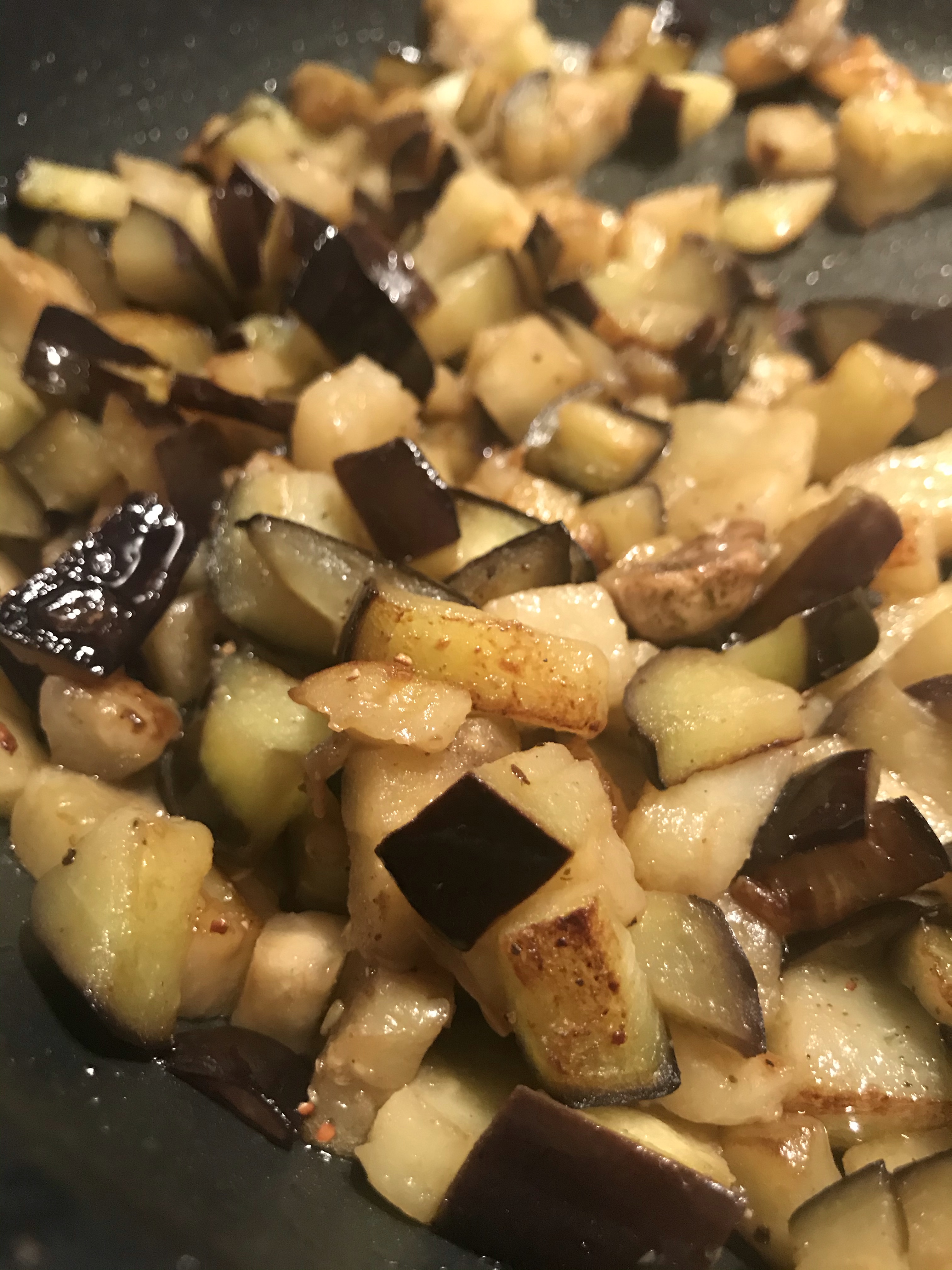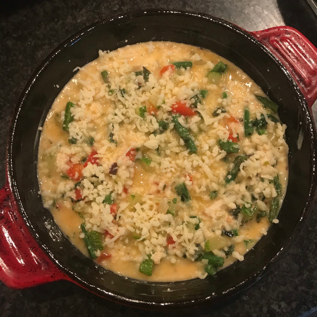 Vet deze in met boter , wanneer het groentemengsel gaar is in de ovenschaal scheppen en voeg het eimengsel toe.