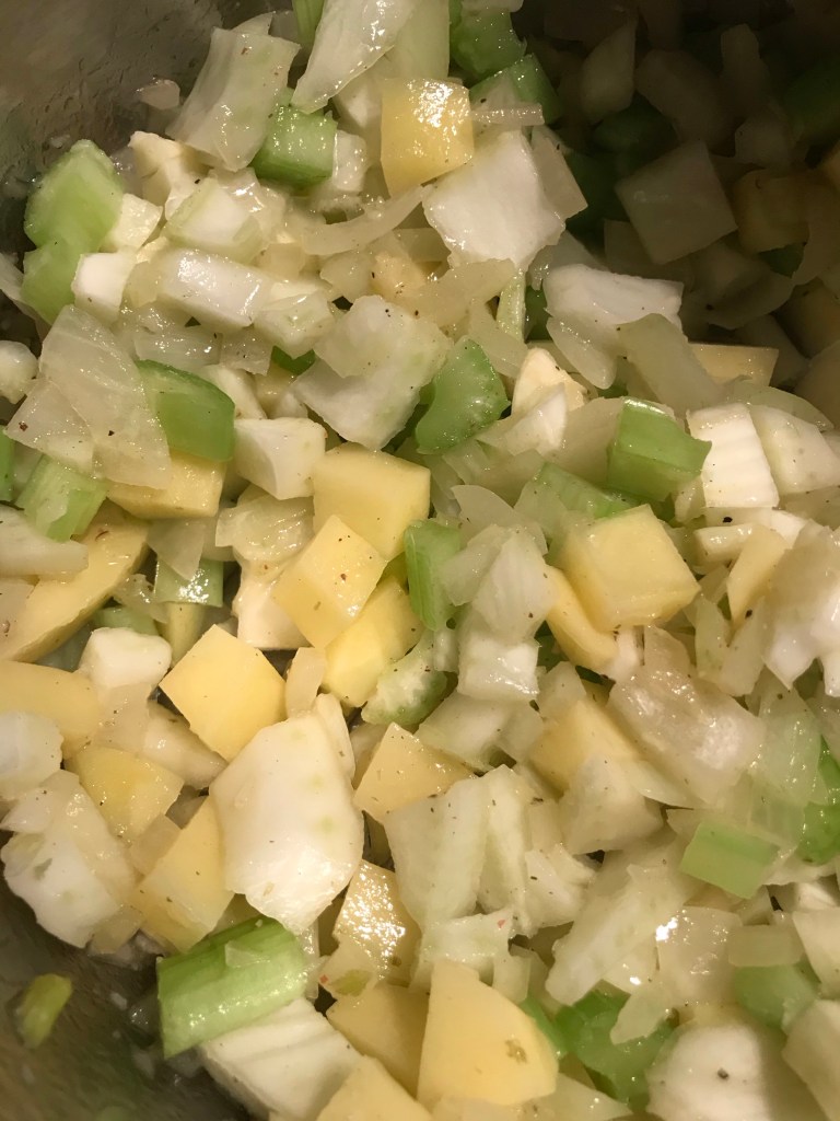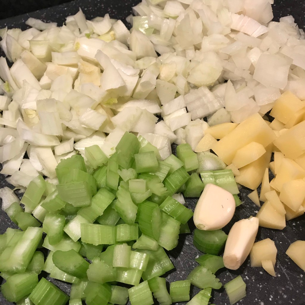 Voeg de venkel , aardappel, bleekselderij en knoflook toe en bak 5 min. mee.