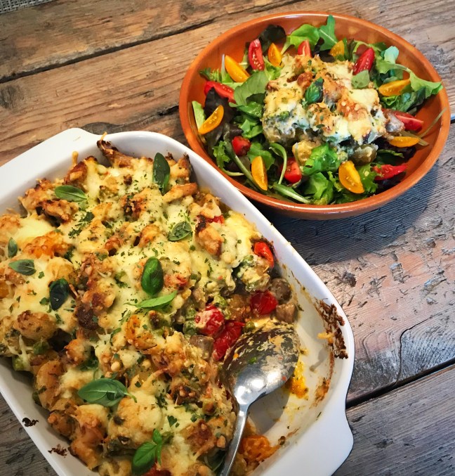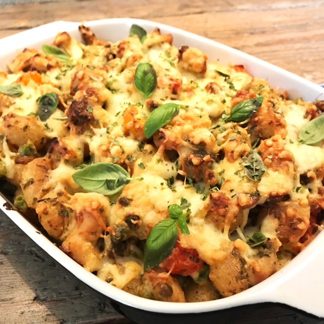 Snijd het basilicum grof en verdeel over de ovenschotel