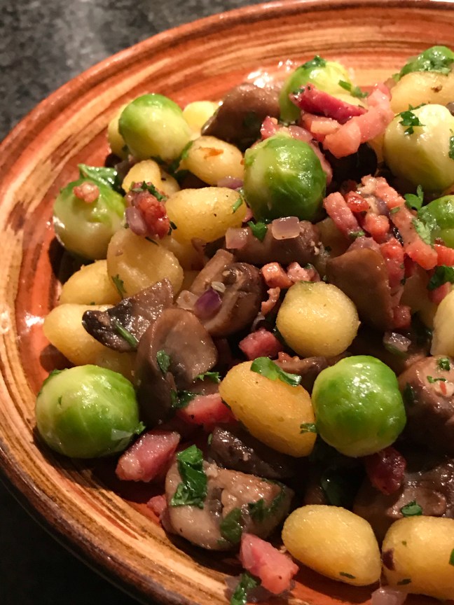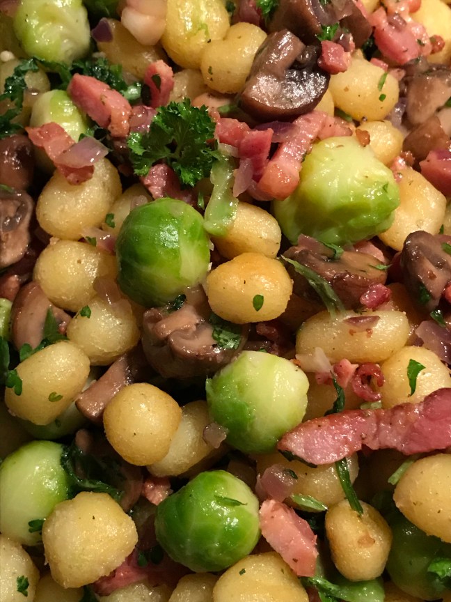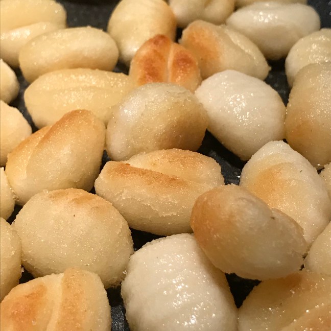 Verhit de helft van de olie in een grote koekenpan en bak de gnocchi in 15 min. goudgeel.