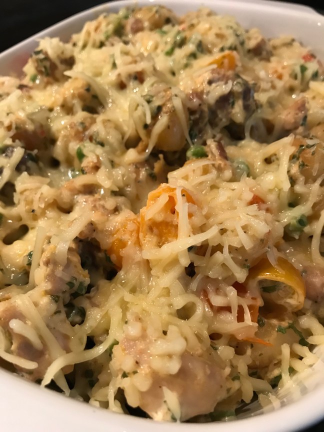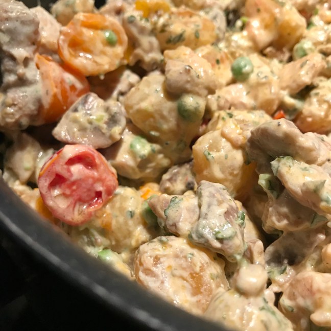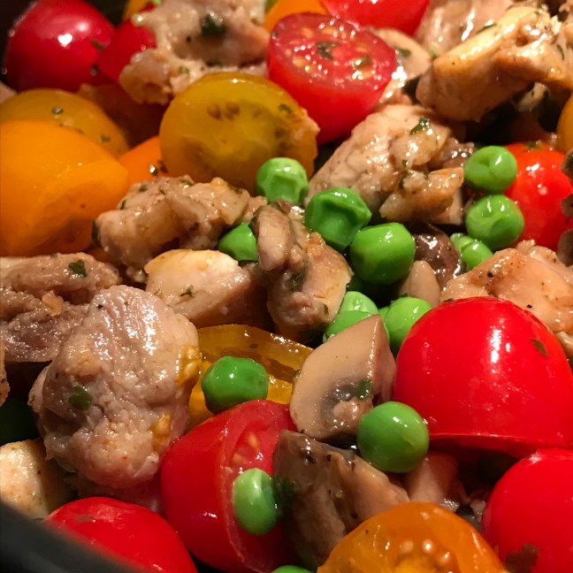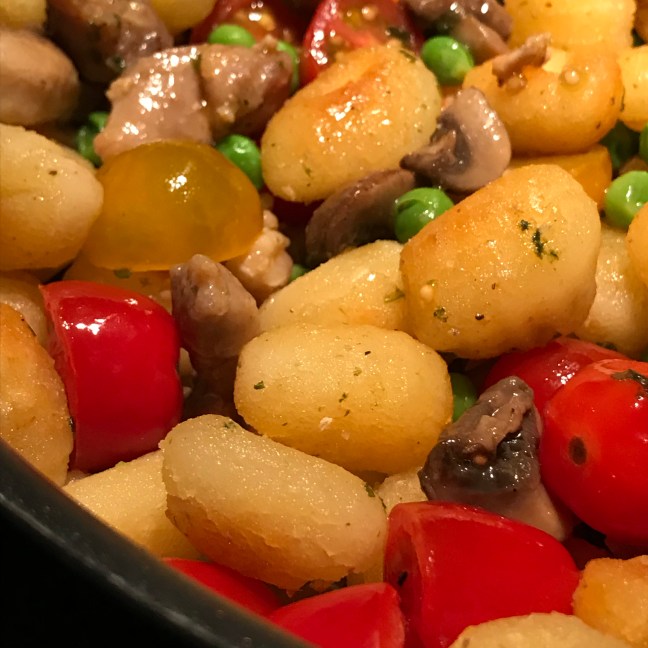 Halveer de cherrytomaten en voeg samen met de tuinerwtjes en de gnocchi toe aan de kip.