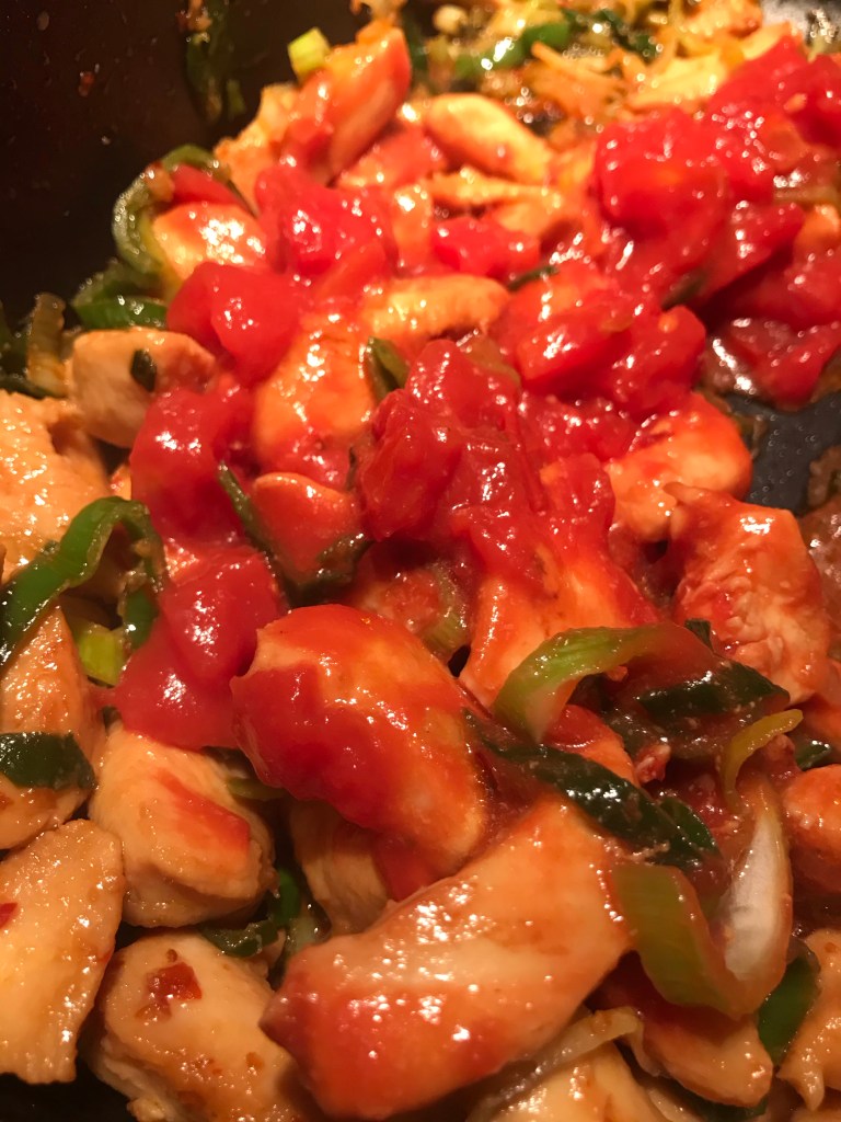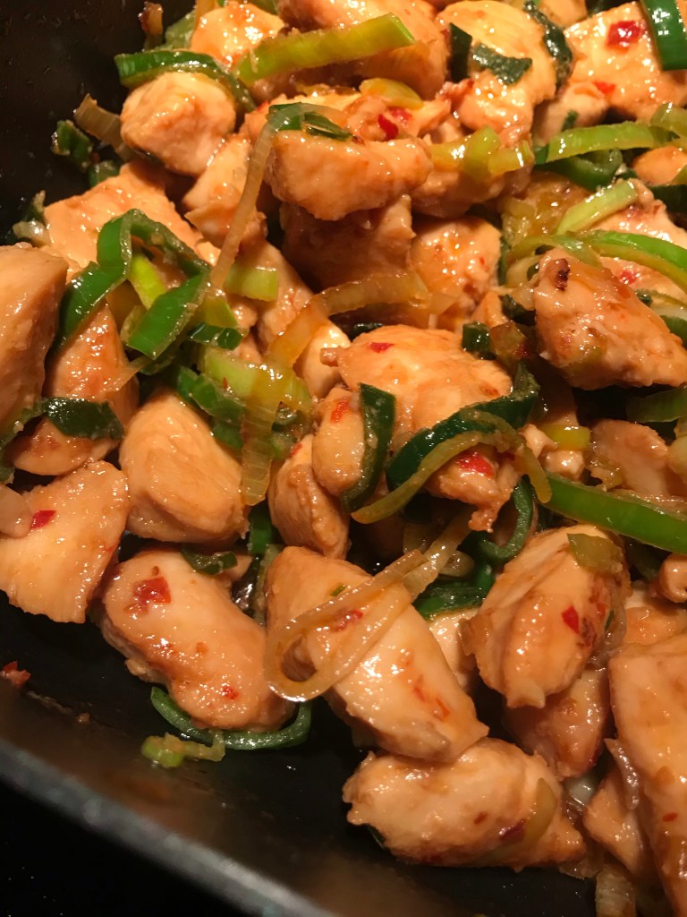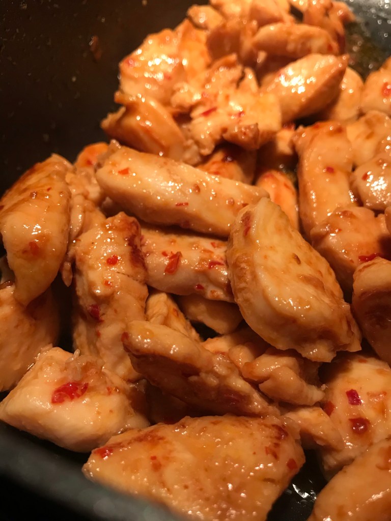 Snijd kipfilet of kippendijfilet in blokjes en bak deze aan in 2 eetlepels olie , ca.5 minuten. ( Ik voegde er een theelepel sambal aantoe , maar dat is naar smaak)