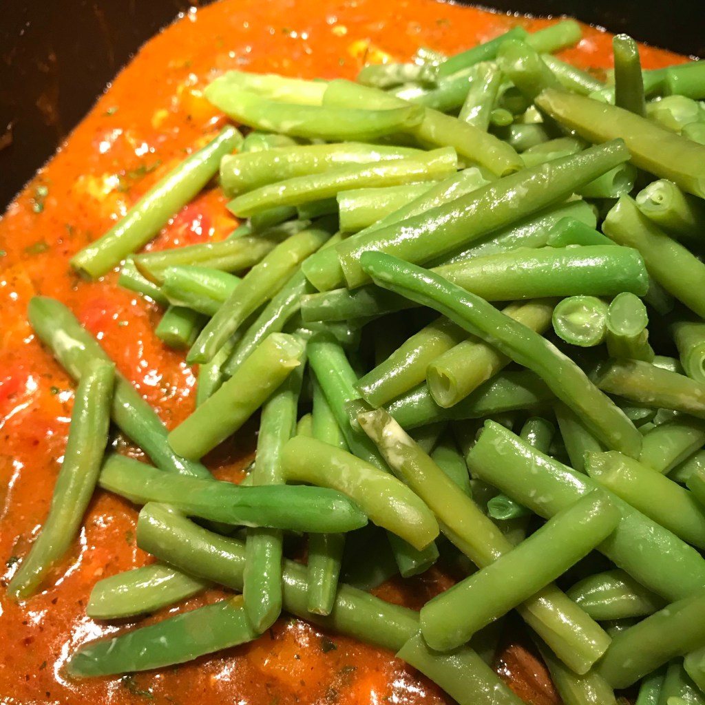 Afgieten en schep de sperziebonen voorzichtig door de saus.