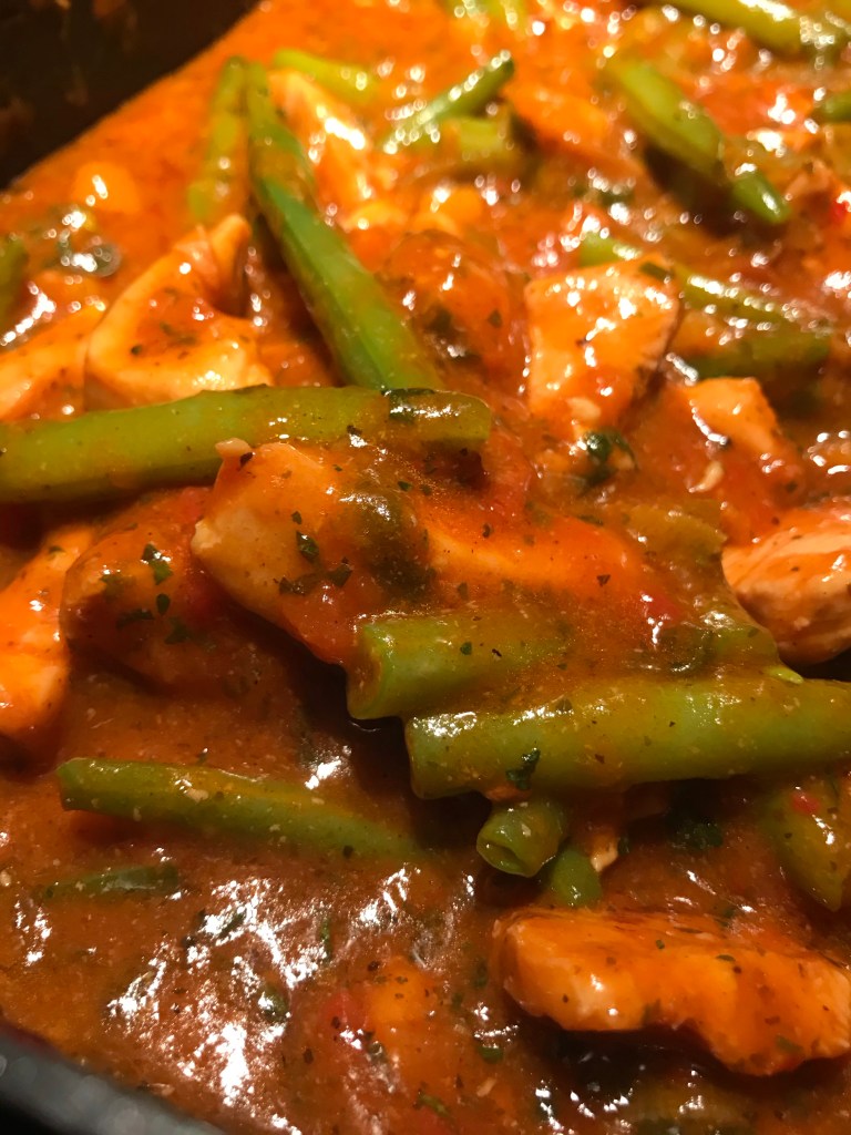 Kip in Apricot & Coriander sauce met Sperziebonen en Rijst