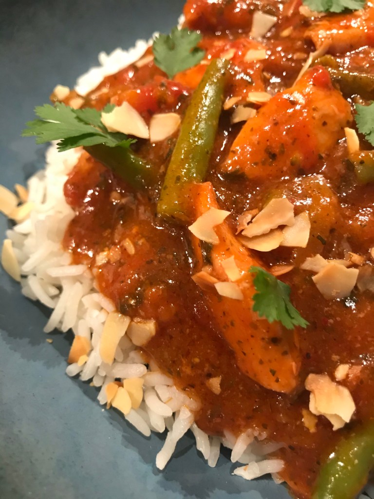 Garneer met verse koriander en amandelschaafsel en serveer met rijst.