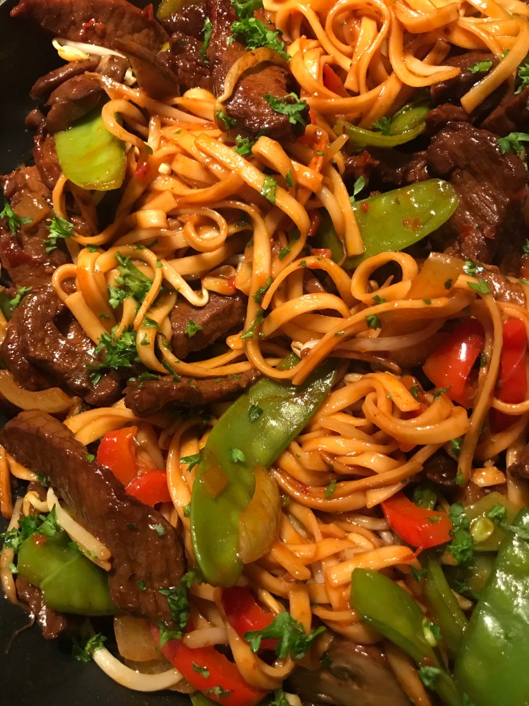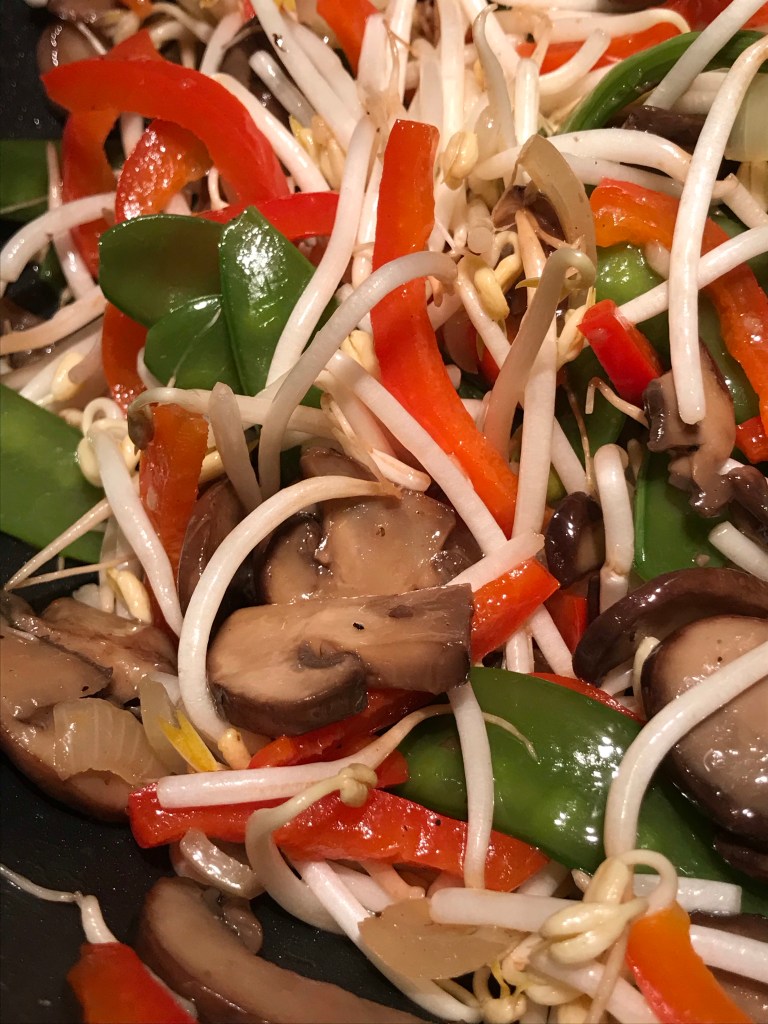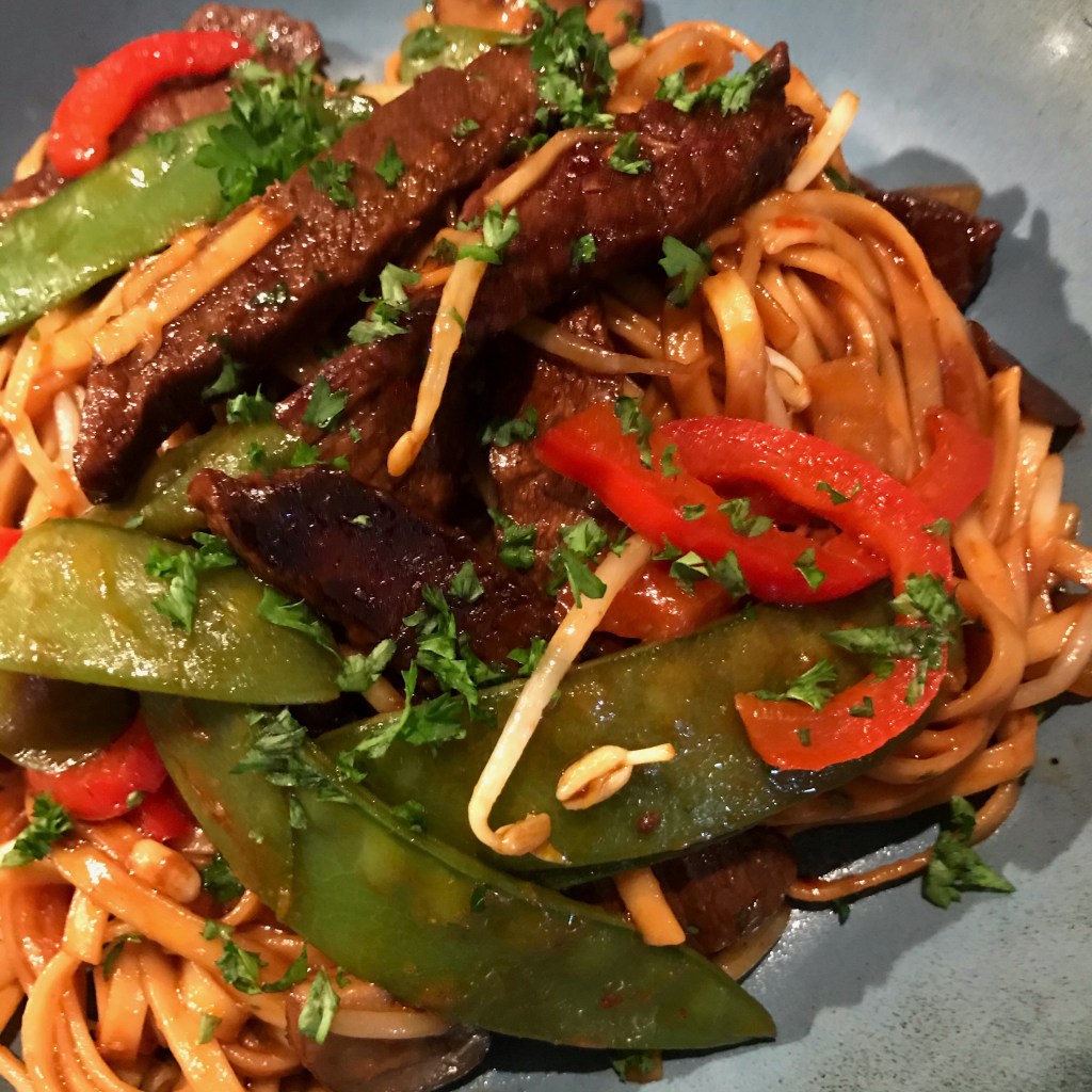 Schep regelmatig om. Voeg de eiermie , peultjes , taugé , marinade en biefreepjes toe en bak nog 2 min. op hoog vuur mee.