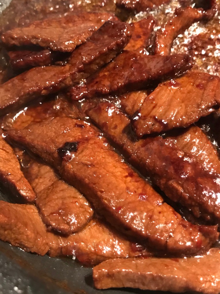 Biefstuk in reepjes snijden en in de marinade leggen , voor minstens een uur.