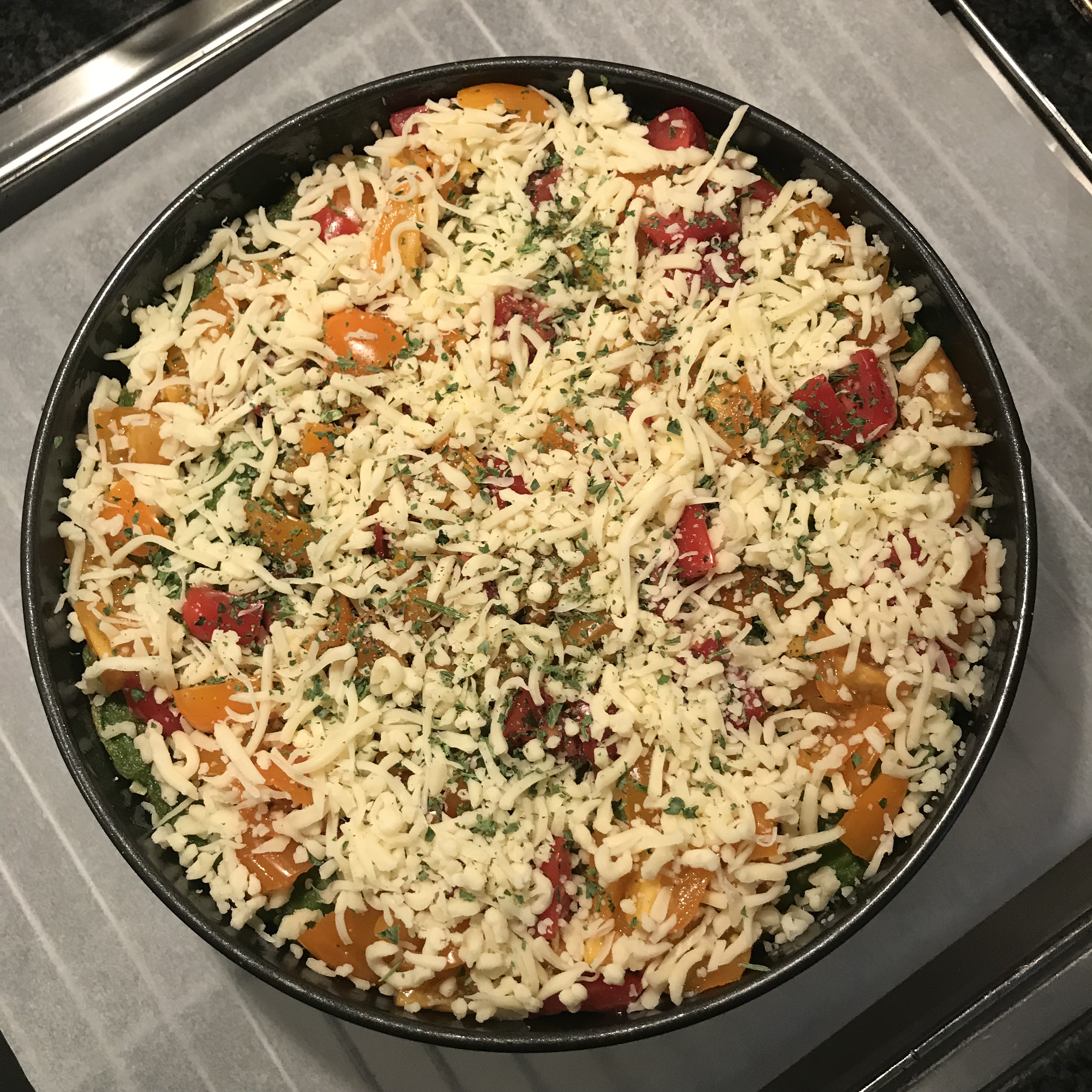 Eindig met een pannenkoek en bestrooi deze met geraspte kaas , Provençaalse kruiden en als laatste een beetje olijfolie.