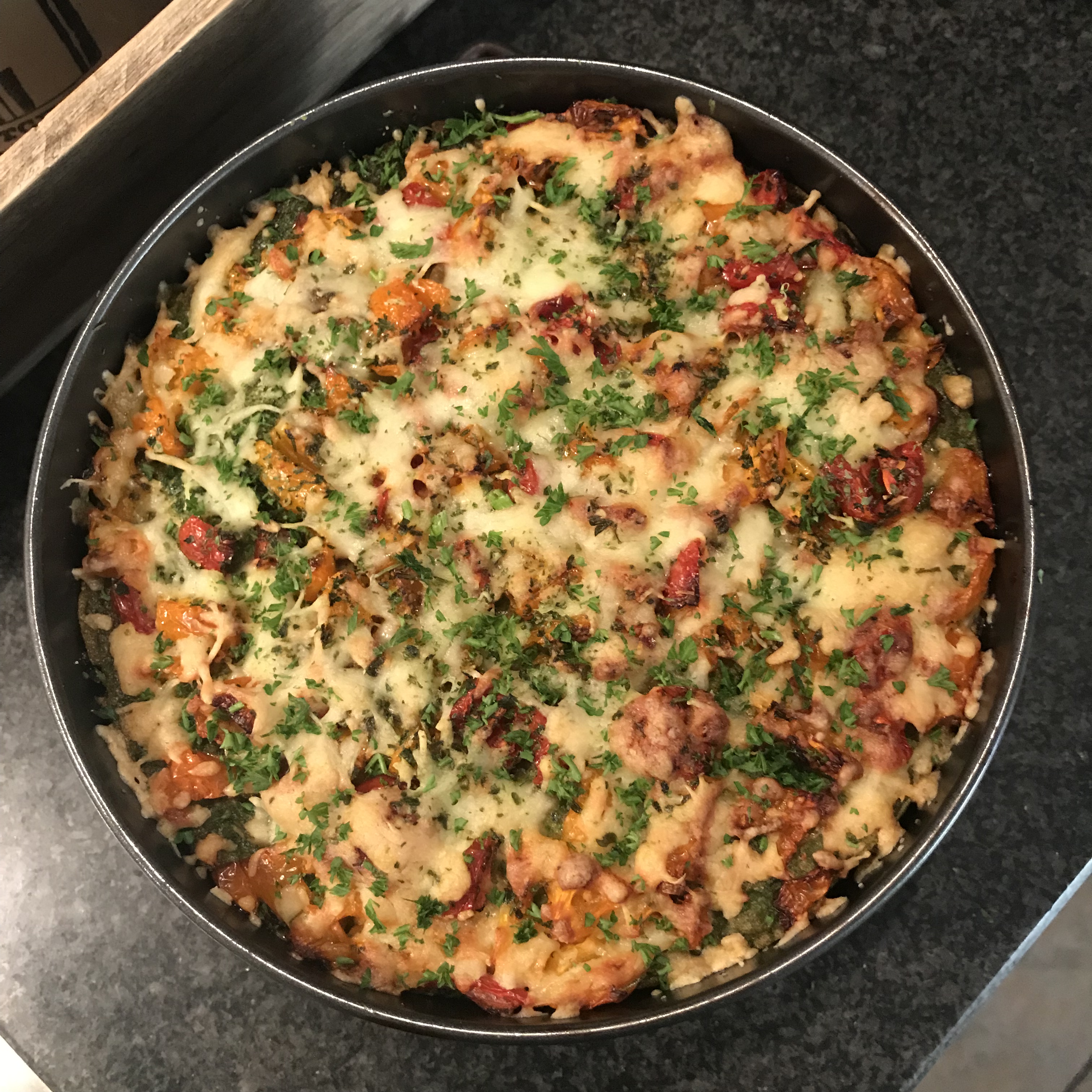 Eindig met de pannenkoek en bestrooi / beleg deze met geraspte kaas , tomaatjes en verse peterselie en als laatste een beetje olijfolie .