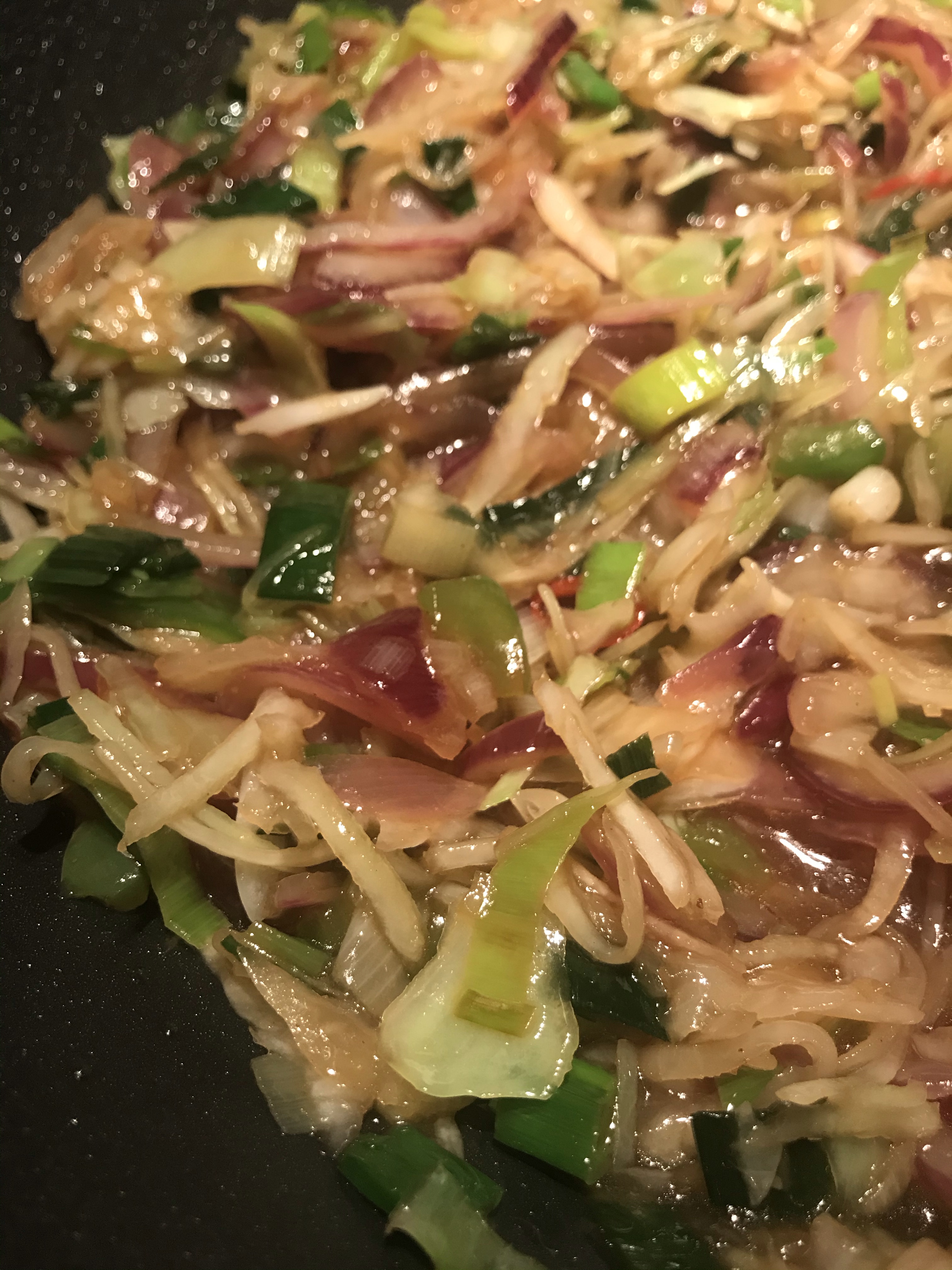 Fruit het wit van de bosui 2 minuten in het achtergebleven braadvet.
