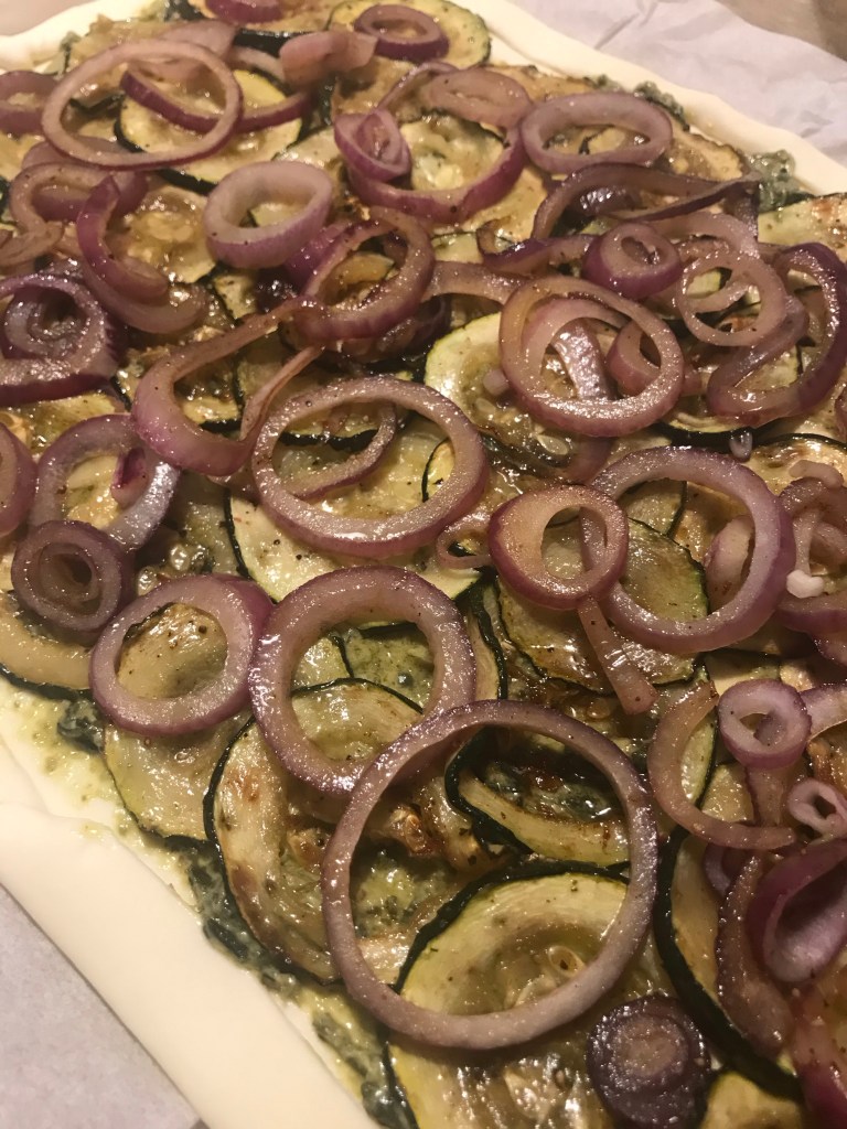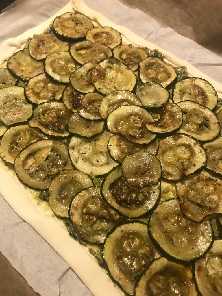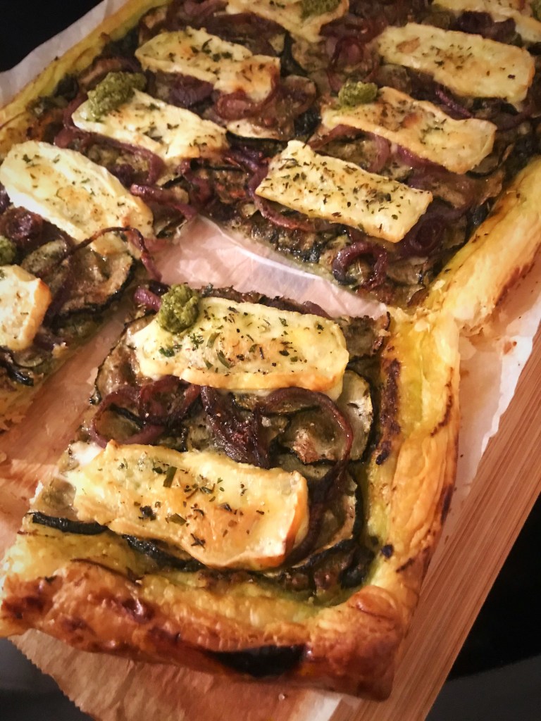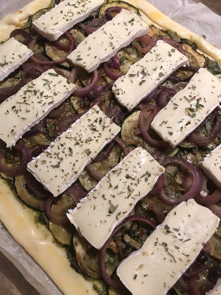 Rol het bladerdeeg uit en leg het op een met bakpapier beklede bakplaat.