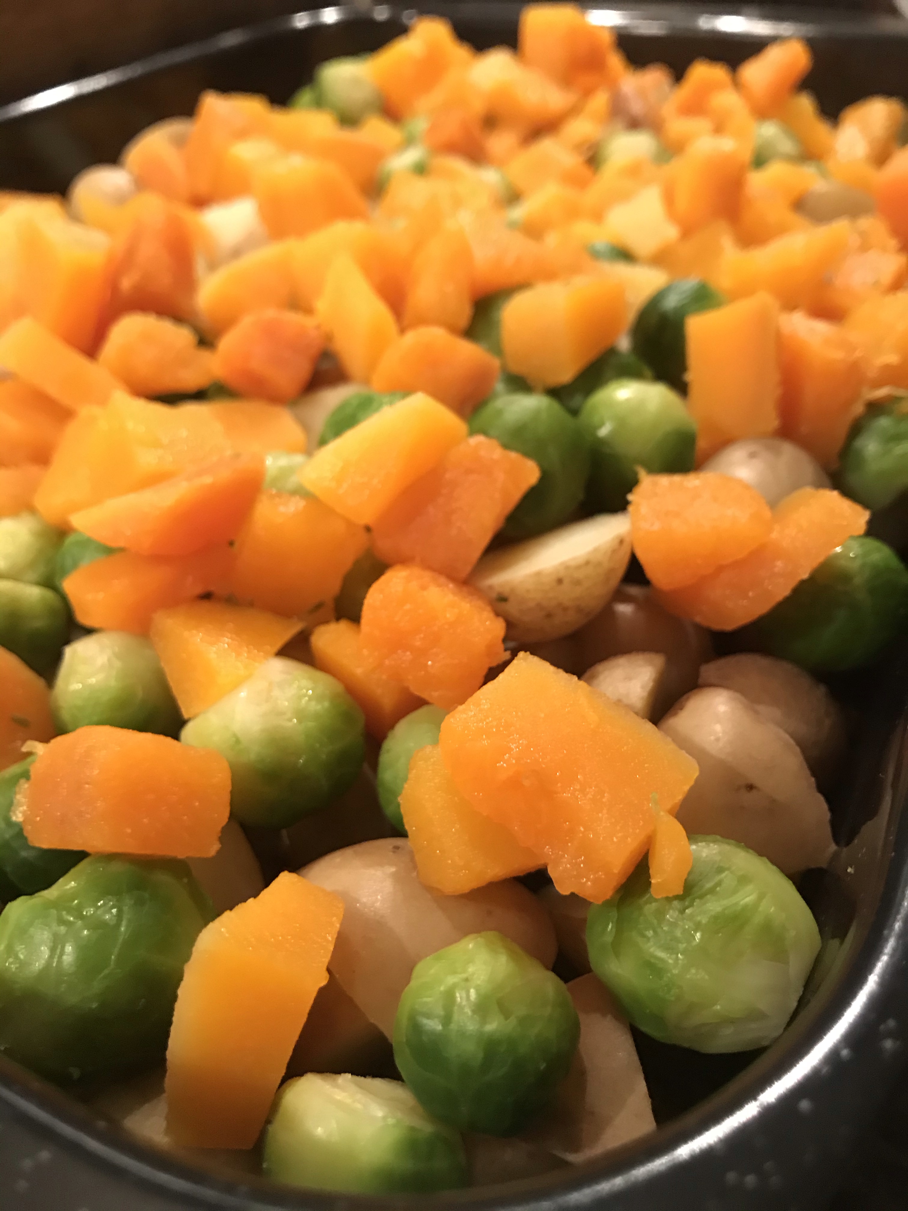 Meng in een kom de pompoenblokjes , ui en knoflook samen met de garam Masala en olijfolie.