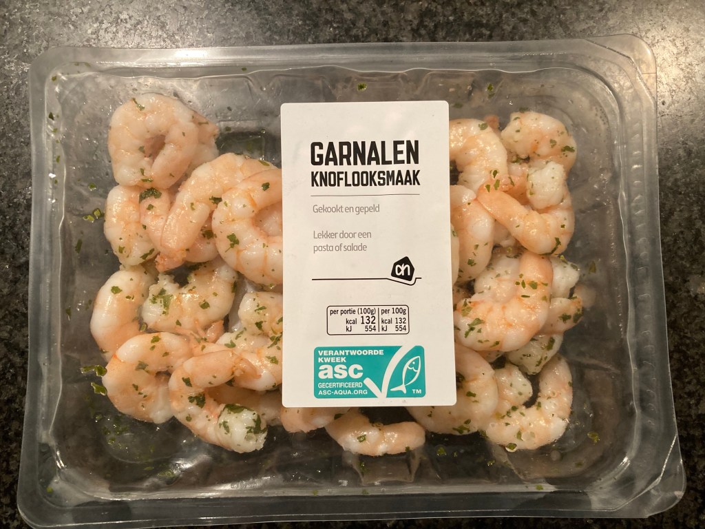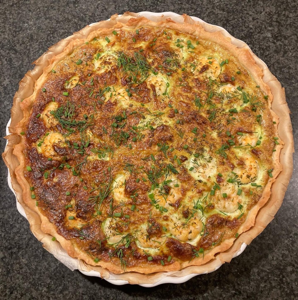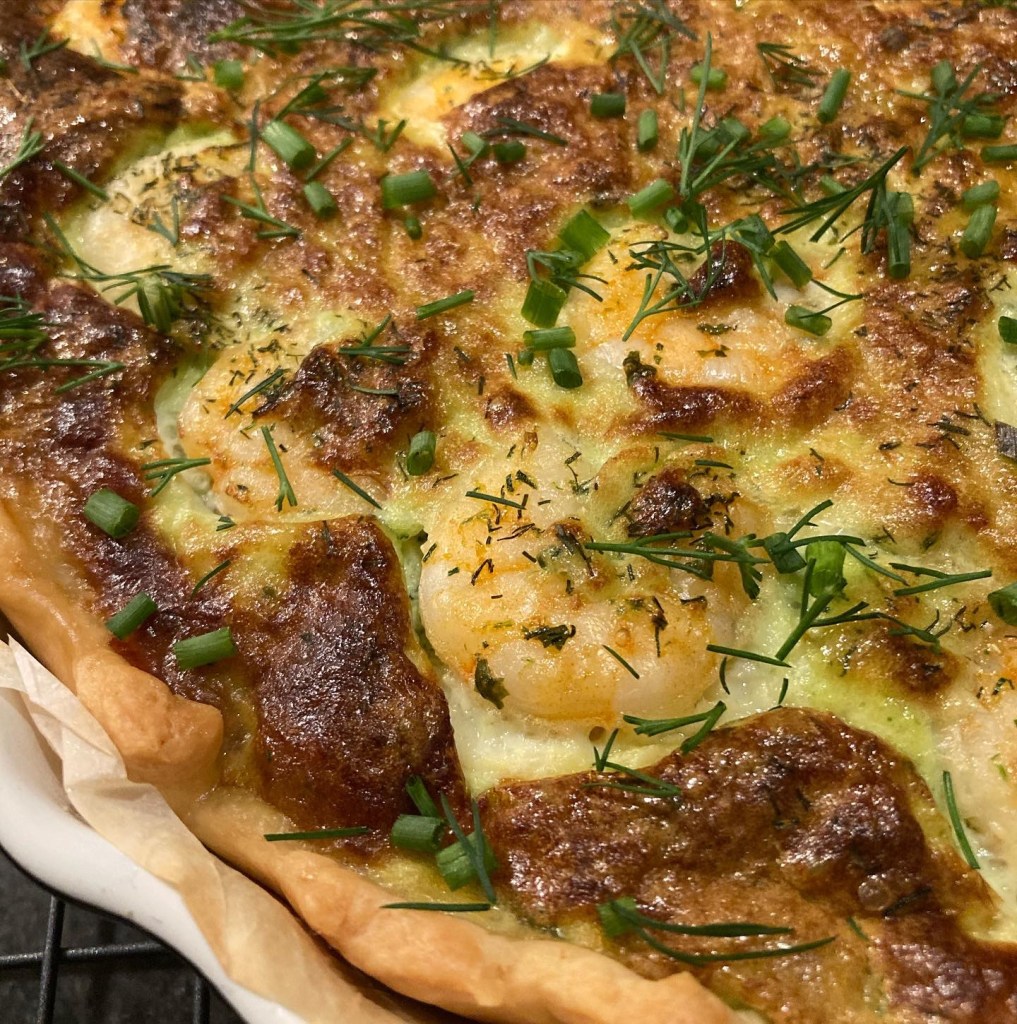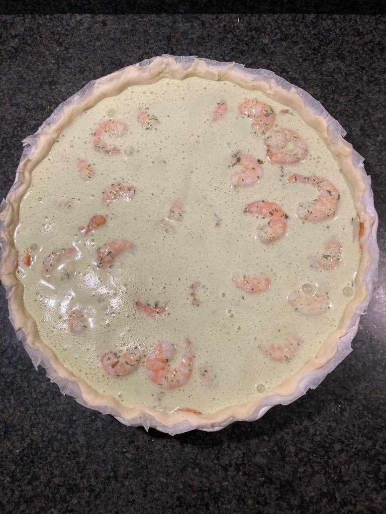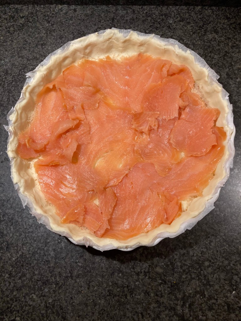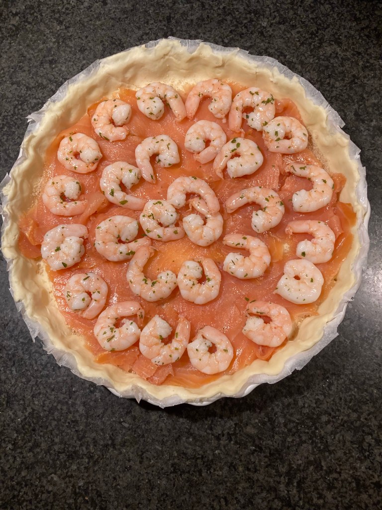 Verdeel de gerookte zalm en garnalen over het deeg.