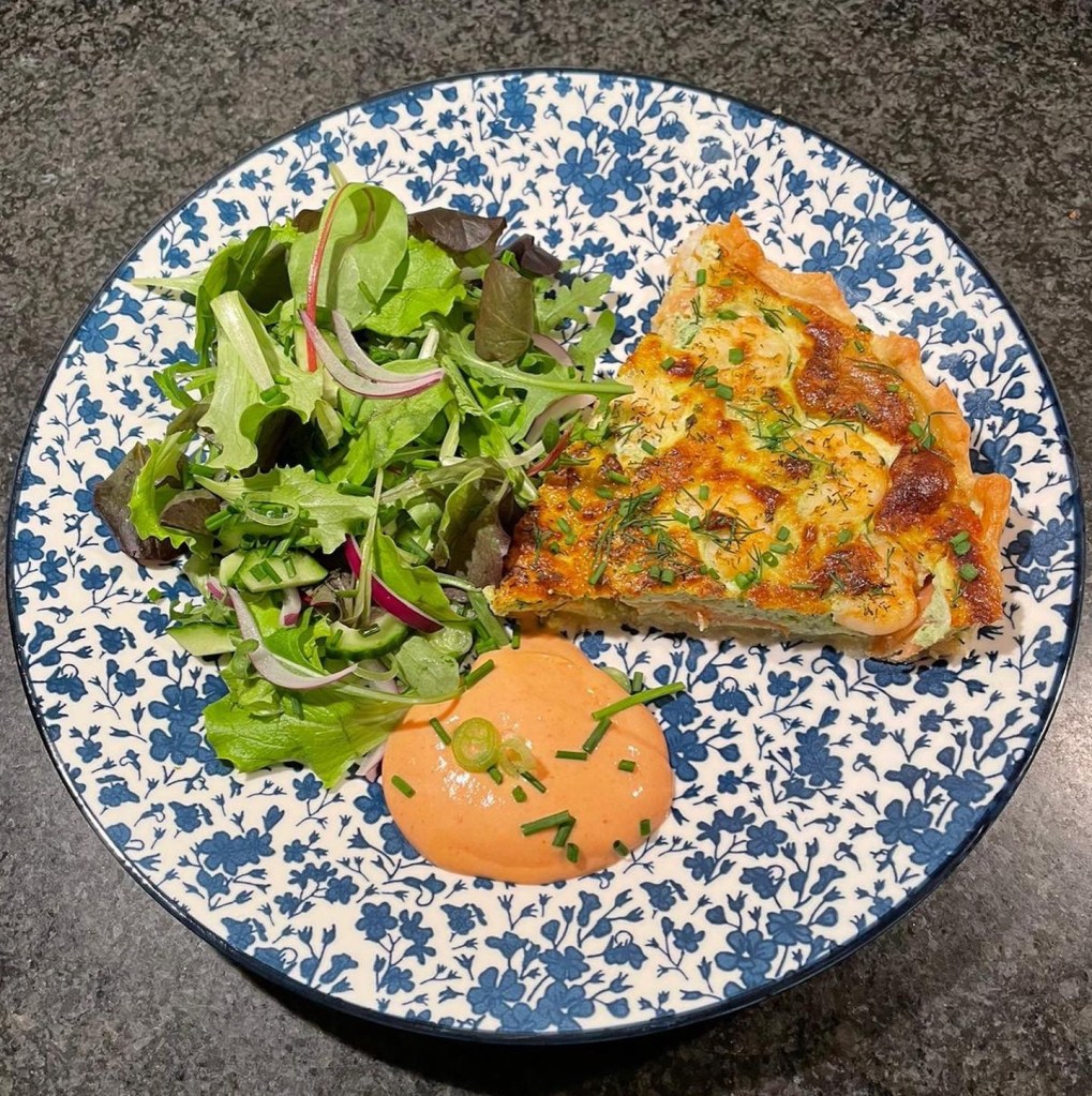 Neem de quiche uit de oven en meng de dressing door de salade.