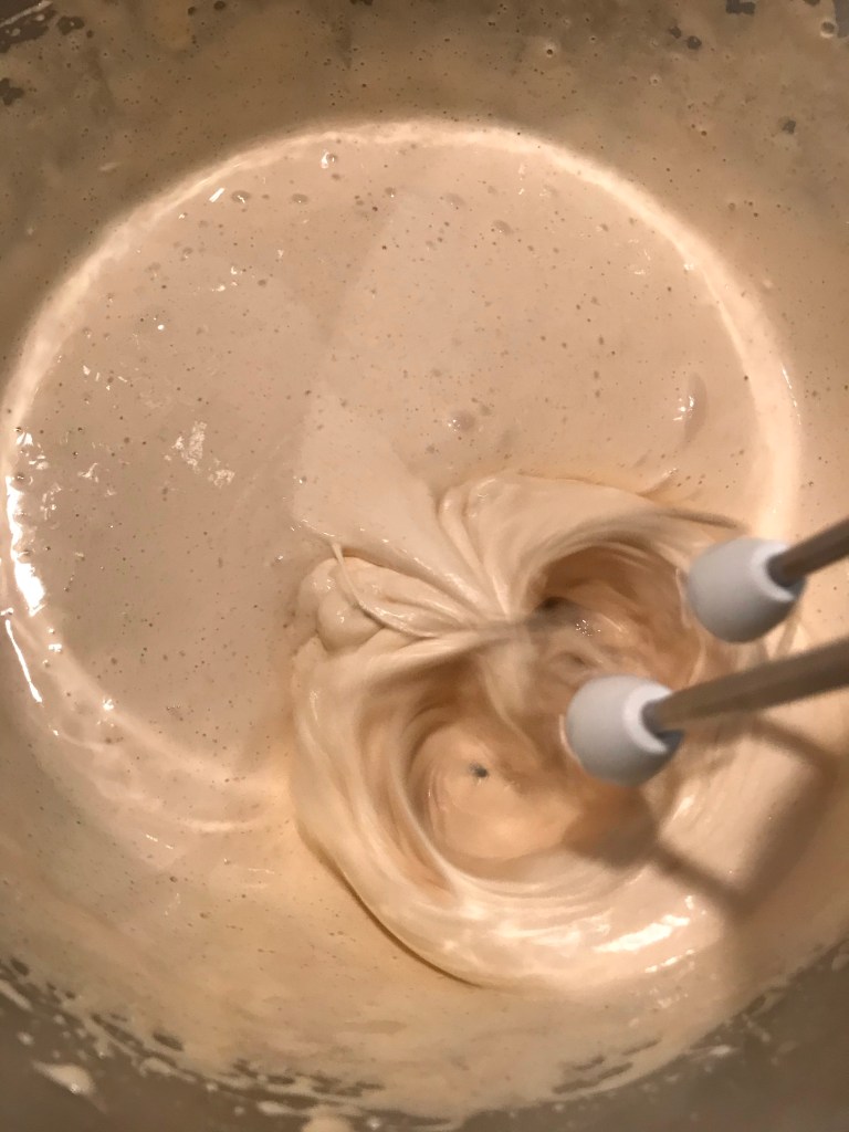 Doe ondertussen de eieren met de suiker in een kom en mix in 3 min. luchtig met een handmixer.